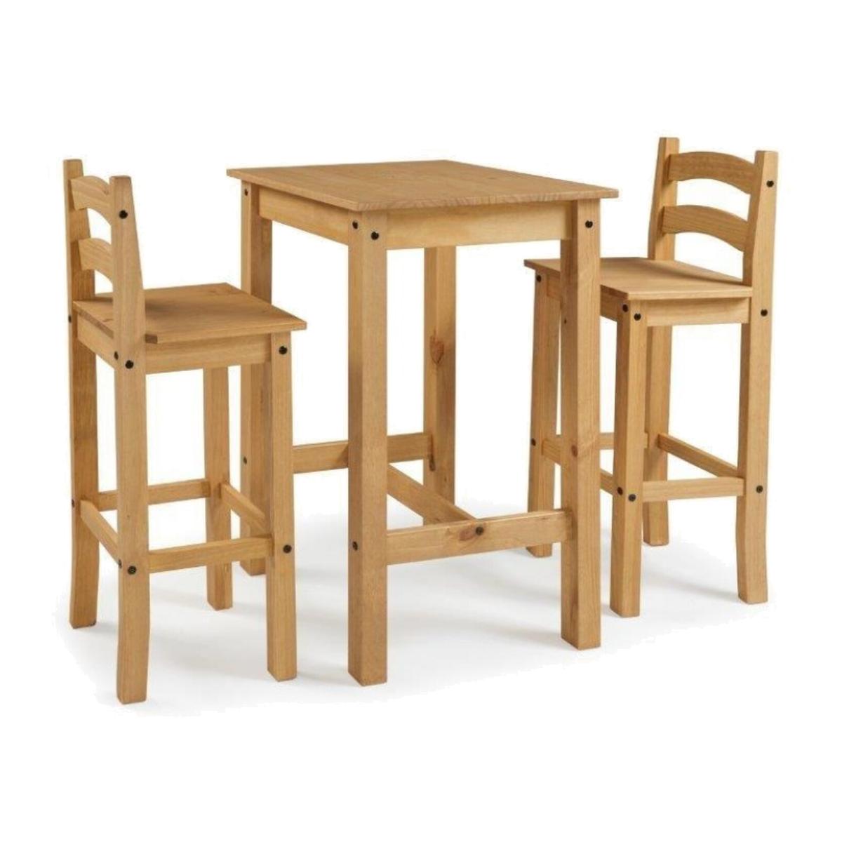 Mercers Furniture is happy to offer this Corona bistro set with 2 barstools, expertly crafted from solid pine and hand waxed to preserve as well as enhance the grain. It offers outstanding value for money that would be a welcome addition to any home.