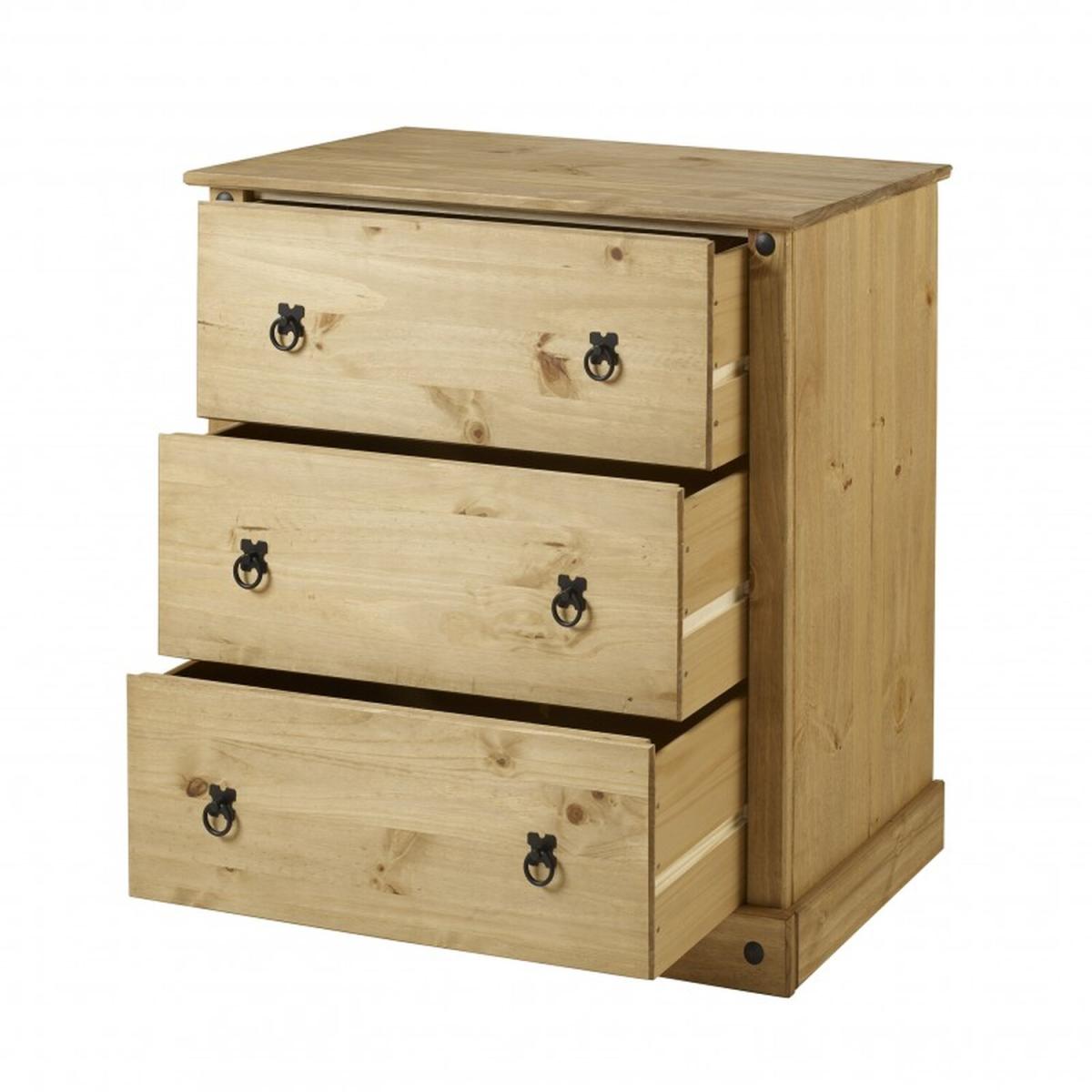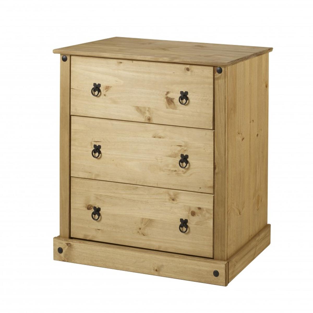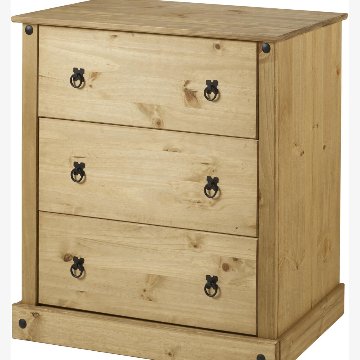 Mercers Furniture is happy to offer this Corona Budget Chest, the item is expertly crafted from solid pine and hand waxed to preserve as well as enhance the grain. It offers outstanding value for money with 3 drawers that would be a welcome addition to any bedroom. It is finished off with black metal fittings which give the item its distinctive Mexican styling and offers that warm rustic country charm. The item has hardboard backs and drawer bases, its delivered flat packed for easy home assembly with step-by-step instructions. Height - 85cm. Width - 83cm. Depth - 38cm