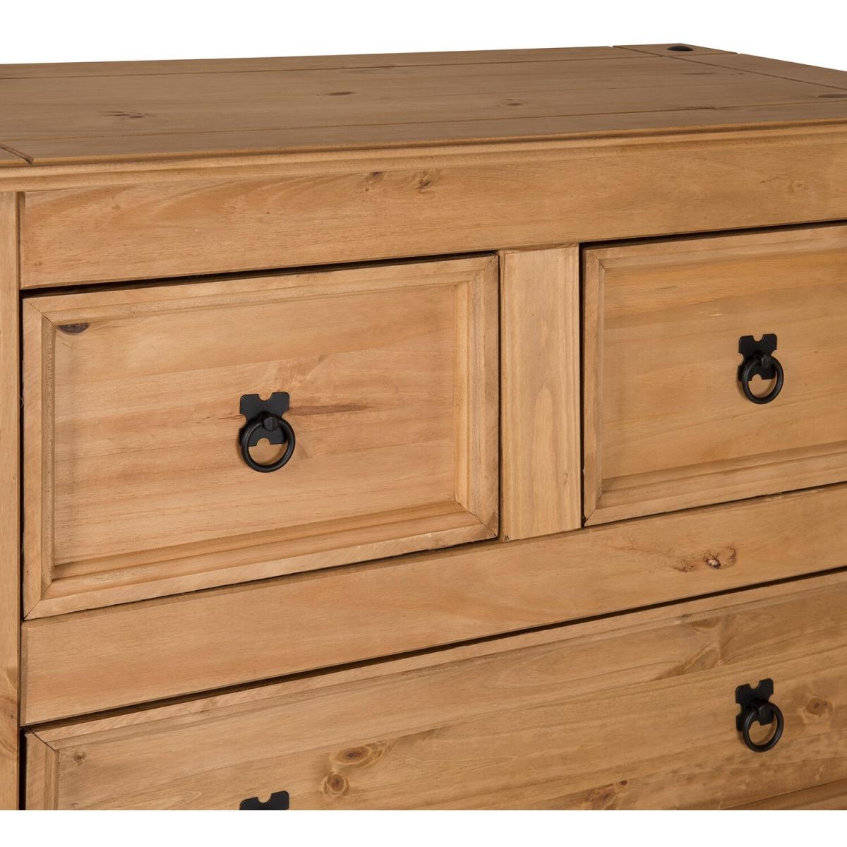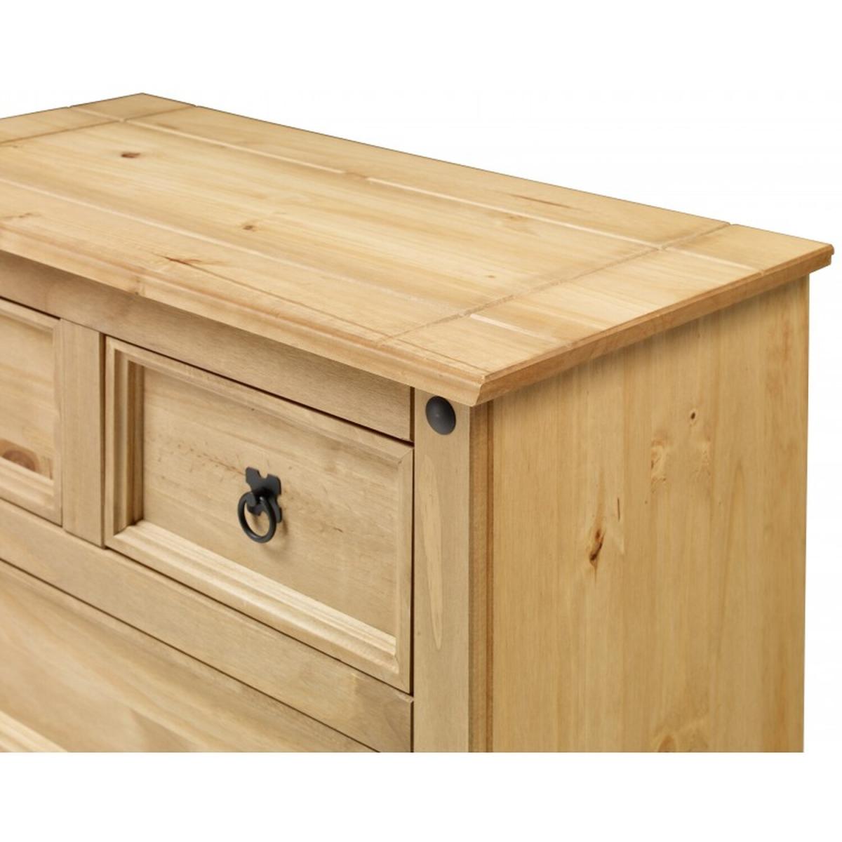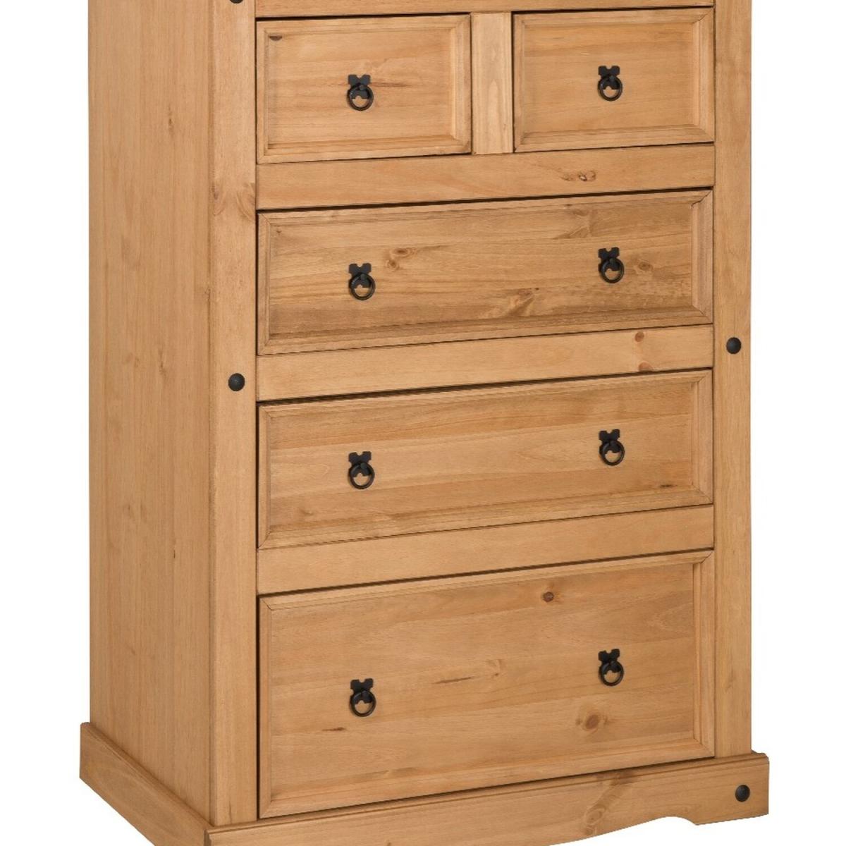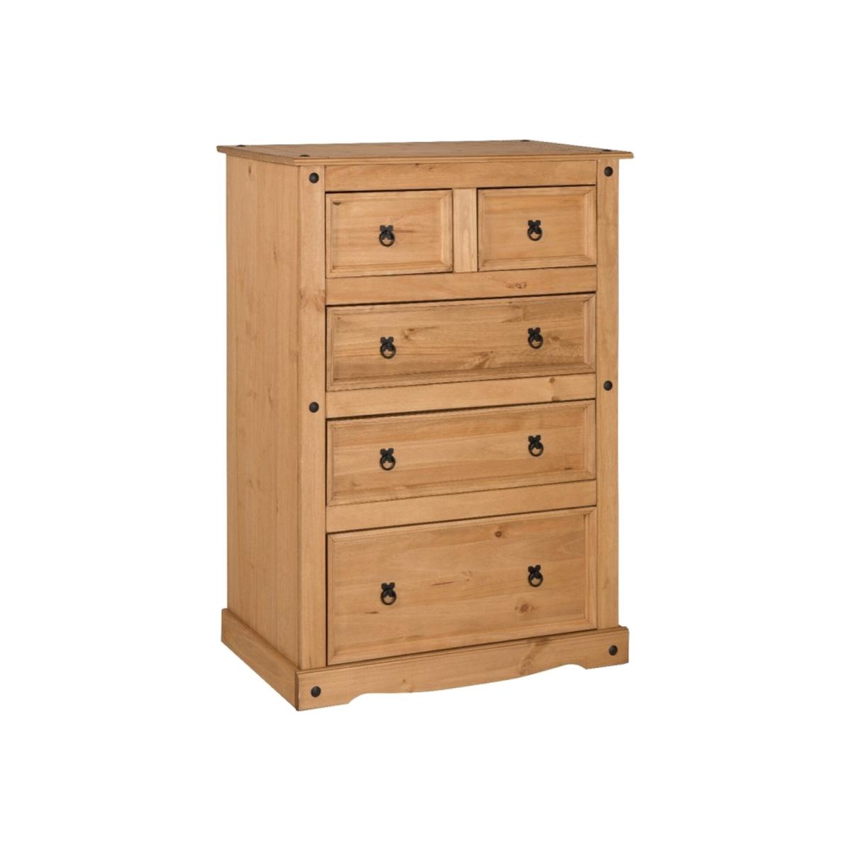 Mercers Furniture is happy to offer this Corona Compact 23 Chest, the item is expertly crafted from solid pine and hand waxed to preserve as well as enhance the grain. It offers outstanding value for money with 5 drawers that would be a welcome addition to any room. It is finished off with black metal fittings which give the item its distinctive Mexican styling and offers that warm rustic country charm. The item has hardboard backs and drawer bases, its delivered flat packed for easy home assembly with step-by-step instructions. Height - 113cm. Width - 82cm Depth - 40cm