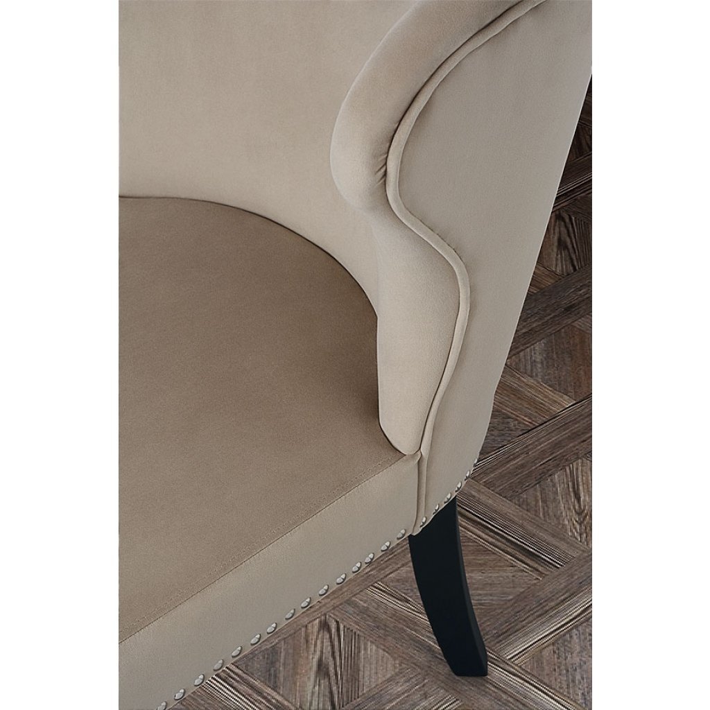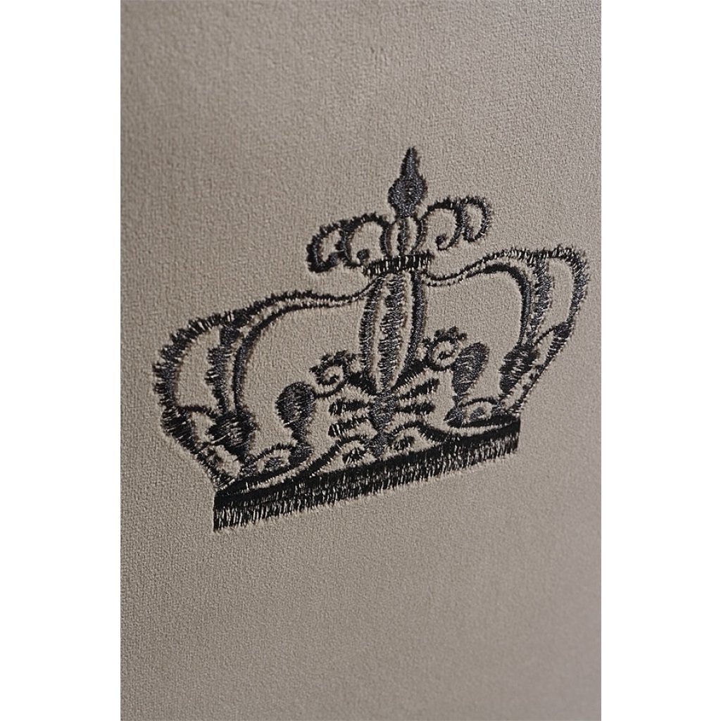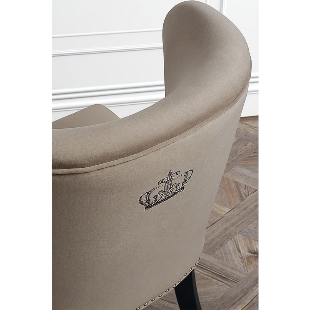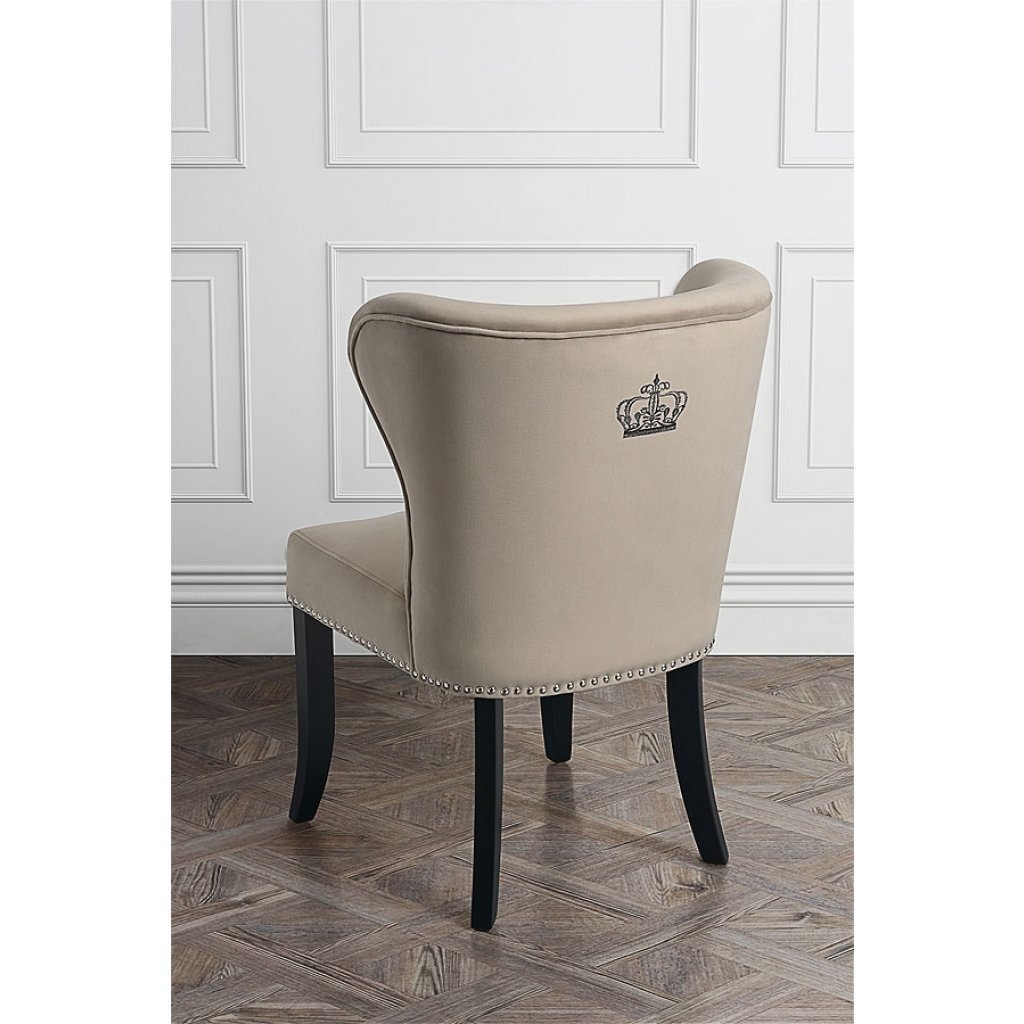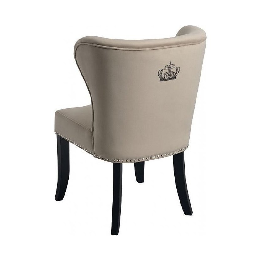 Wraparound back with embroidered crown motif. Comfortable sprung seat. Chrome plated upholstery tacks. Polyester velvet fabric. Black stained solid ash legs. Simple assembly required.