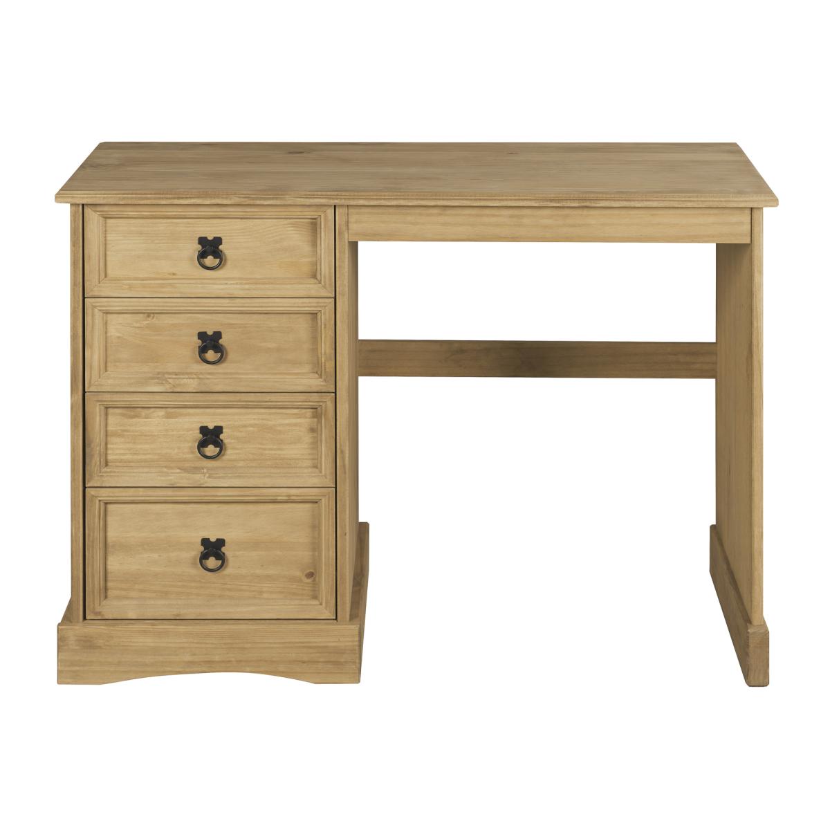 This Corona 4 Drawer Dressing Table not only sports a timeless and rustic look but also adds much needed storage space to any bedroom, study or dressing room. 4 spacious Drawers add to the style and allow for more organized storage solution. Crafted from solid pine with no veneers, its hand waxed finish enhances the wood grain and this together with the ornate black hinges, handles and studs create a distressed rustic look. Comes with wooden drawer runners and pine dowel drawer stops.