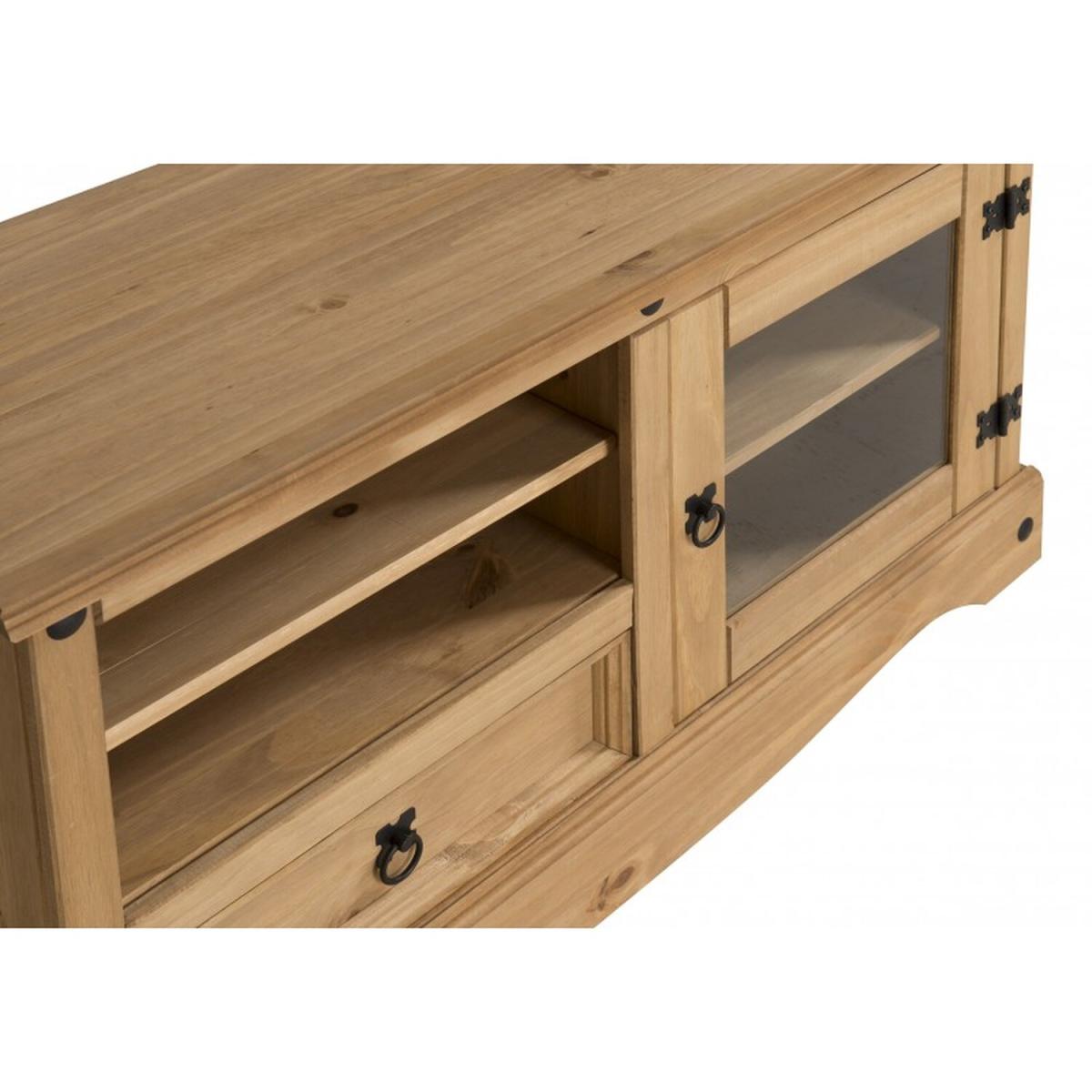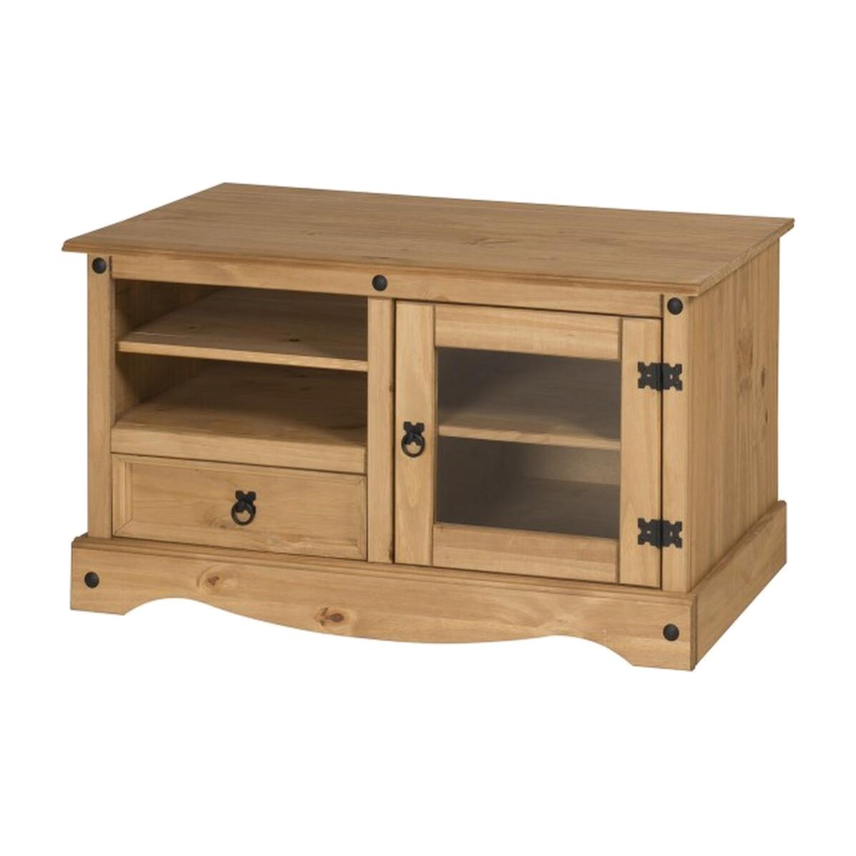 Mercers Furniture is happy to offer this Corona Entertainment Unit, expertly crafted from solid pine and hand waxed to preserve as well as enhance the grain. With shelves, a drawer and a glass door cupboard it offers outstanding value for money that would be a welcome addition to any room. The item is finished off with black metal fittings which give a distinctive Mexican styling and offers that warm rustic country charm. The item has hardboard backs, hardboard drawer base and is delivered flat packed for easy home assembly with step-by-step instructions. Height - 58cm. Width - 106cm. Depth - 44cm