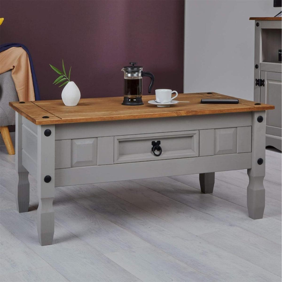 The rustic country style of the Corona Grey Coffee Table will transform and update any living room. Its Grey waxed finish enhances the wood grain and this together with the ornate handle and studs create a distressed rustic look. The country inspired Coffee Table is made from solid pine. Its handy pull out drawer is great for keeping those bits and bobs like magazines or drink coasters in.