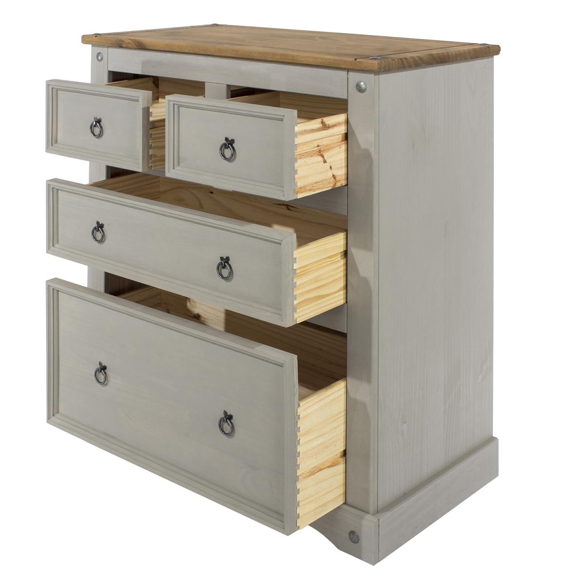 Featuring a solid pine construction with an evocative Mexican design, the Corona Grey chest of drawers consists of two smaller drawers near the top, a regular drawer in the middle and a large drawer at the bottom for excellent bedroom storage. Installation Note: This product should be fixed to a wall using a wall fastener