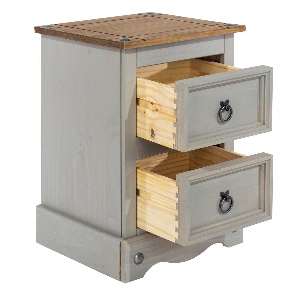 The Corona Grey 2 Drawer Petite Bedside Cabinet crafted from pine wood boasts a clean and practical design perfect for holding all your bedside essentials without taking up too much space. Please note, unfortunately we cannot deliver this item to the Channel Islands.