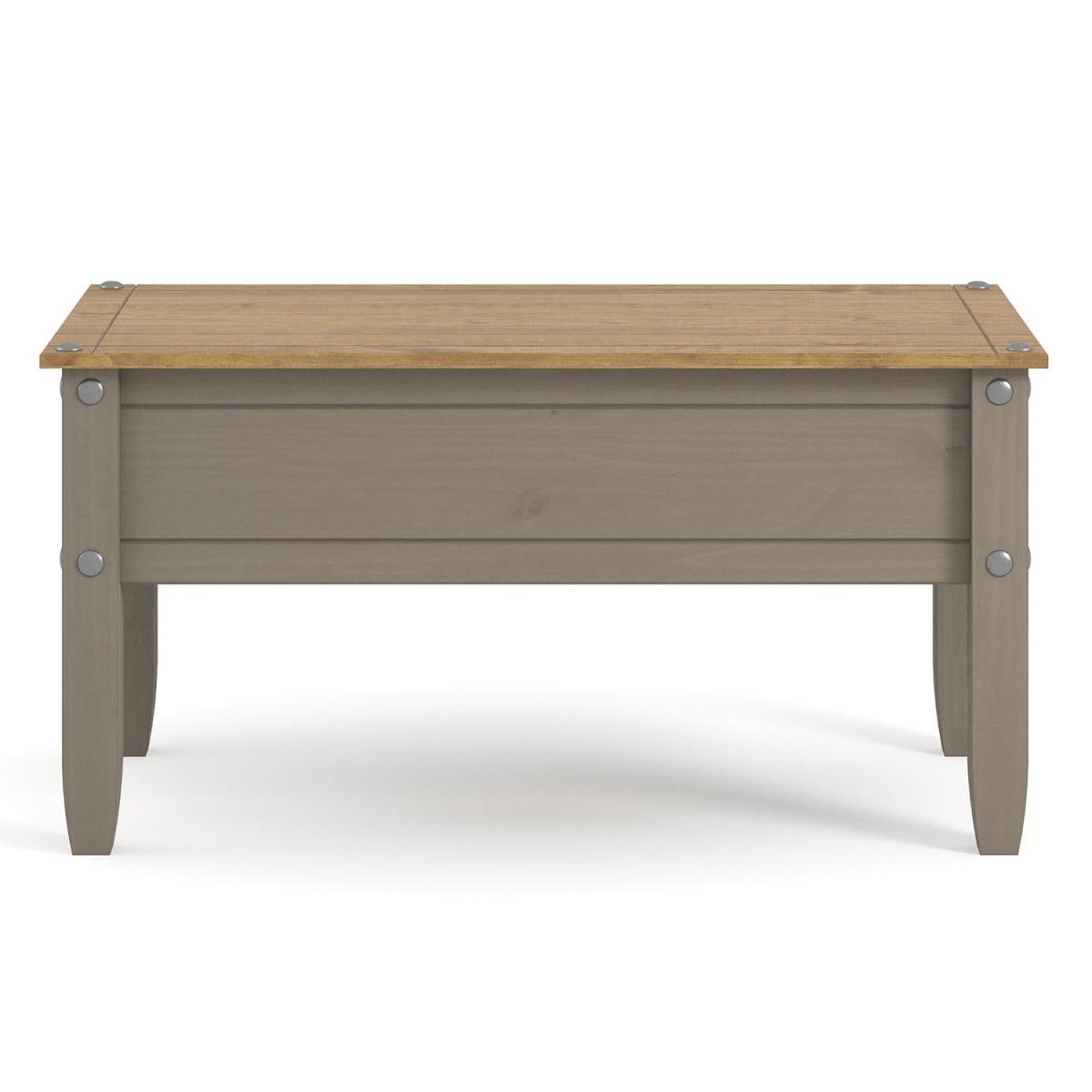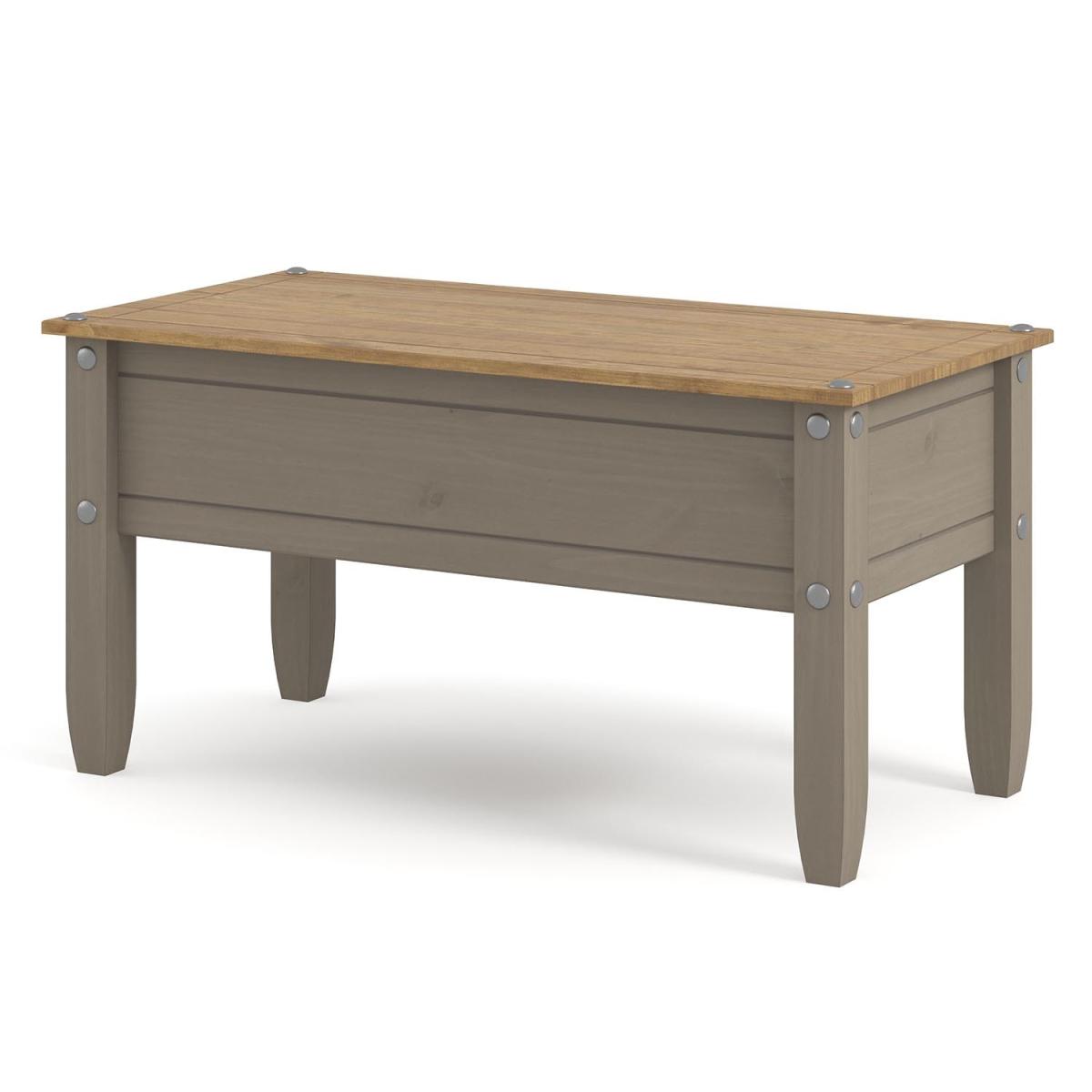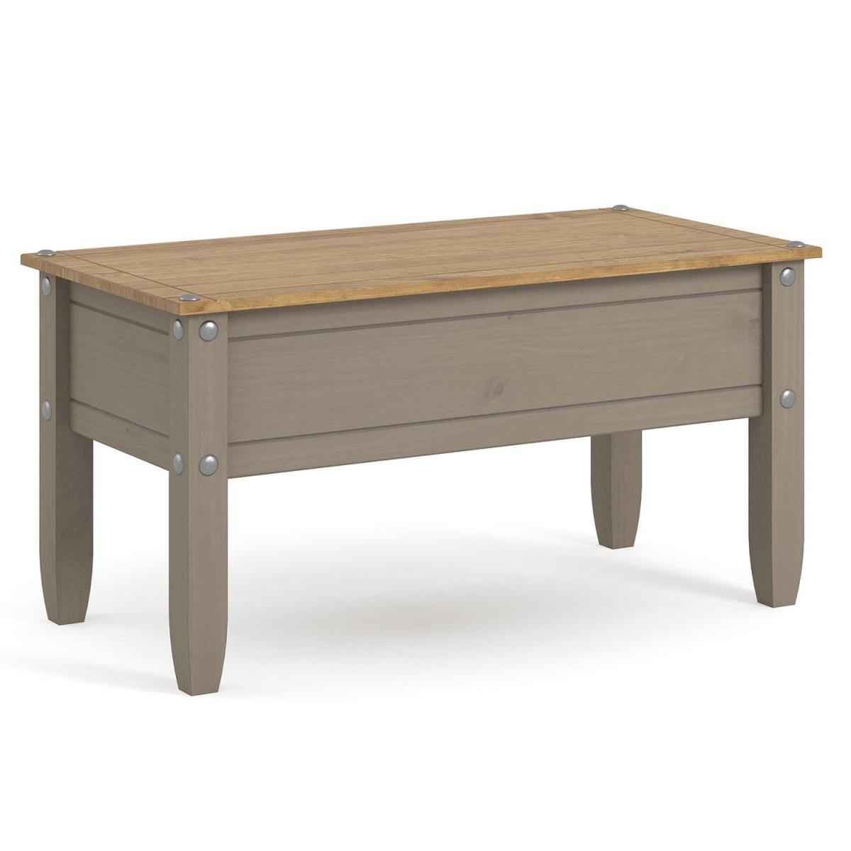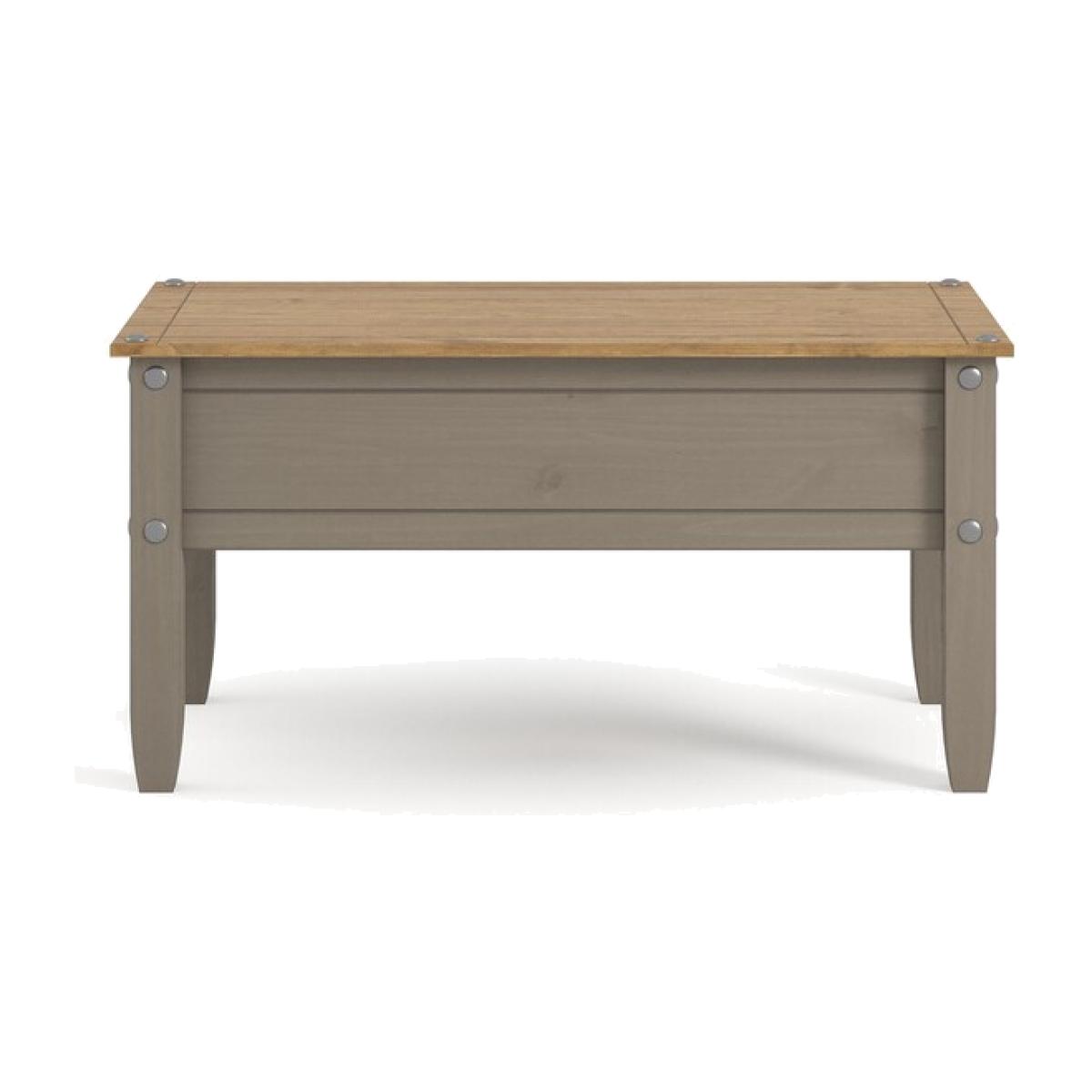 Add a touch of rustic charm to your room with this Corona Grey Washed Coffee Table. Its exposed gun metal grey studs give this piece a stunning rustic look. The long, sturdy waxed table top beautifully contrasts with the grey washed carcase, giving this piece a contemporary look that will complement all your interior decor styles with ease.