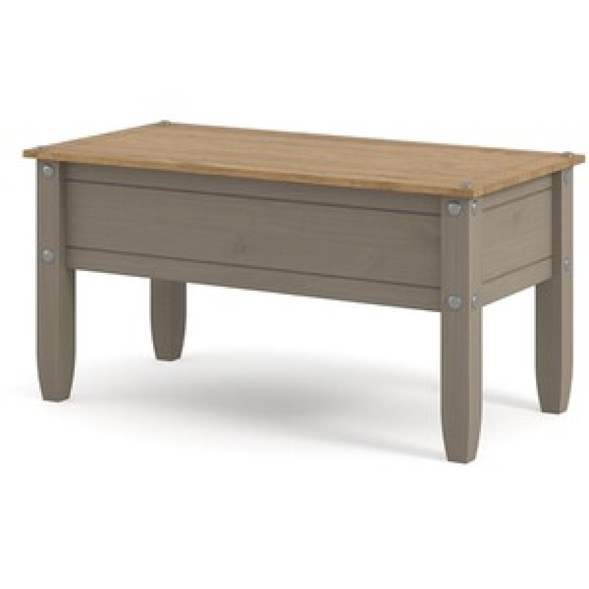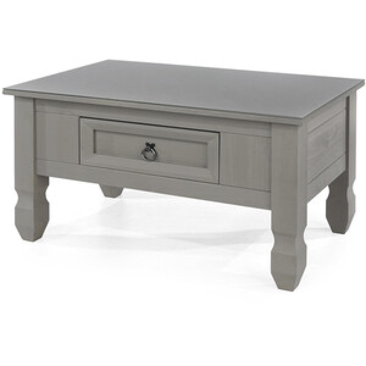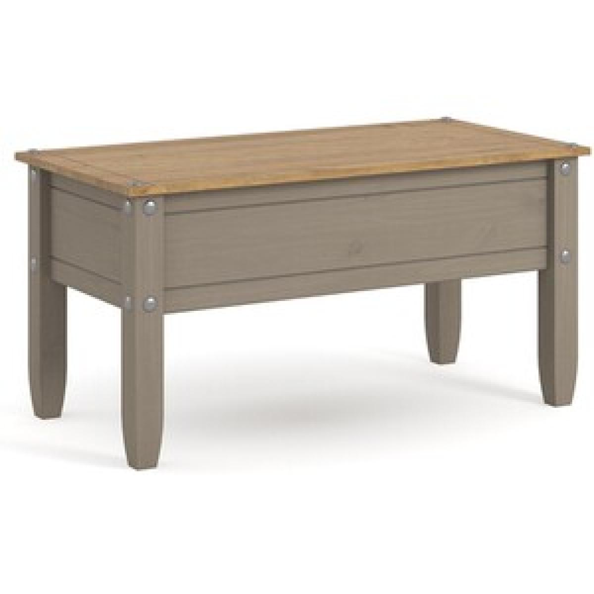 Add a touch of rustic charm to your room with this Corona Grey Washed Coffee Table. Its exposed gun metal grey studs give this piece a stunning rustic look. The long, sturdy waxed table top beautifully contrasts with the grey washed carcase, giving this piece a contemporary look that will complement all your interior decor styles with ease.