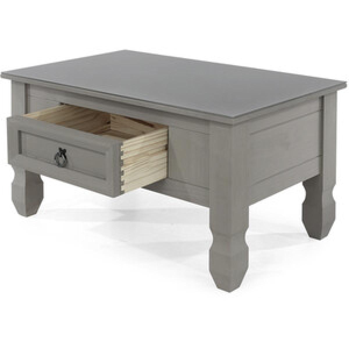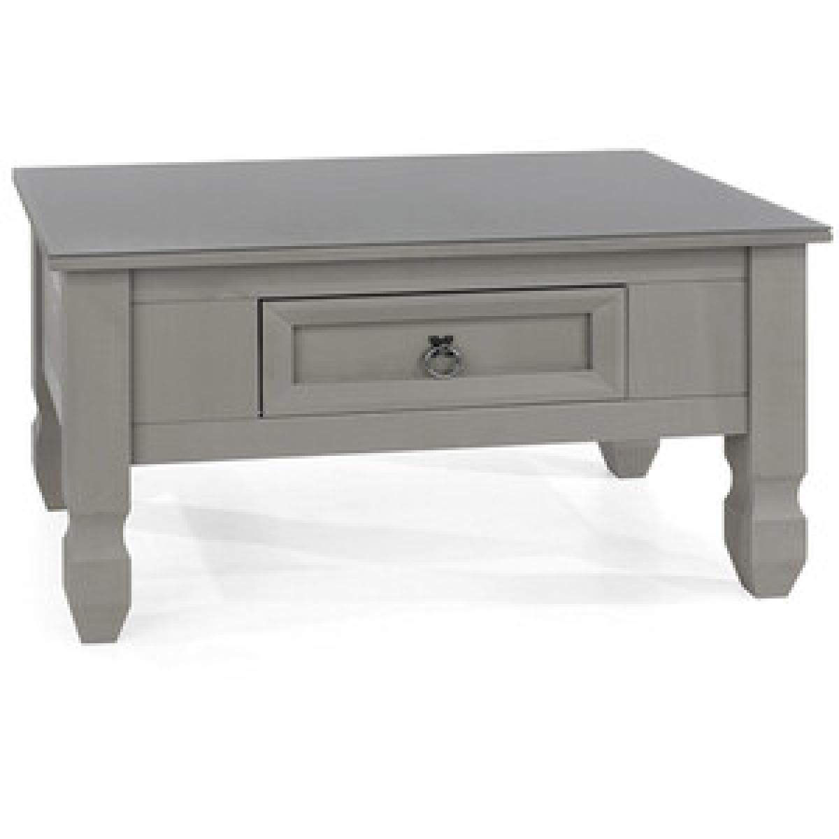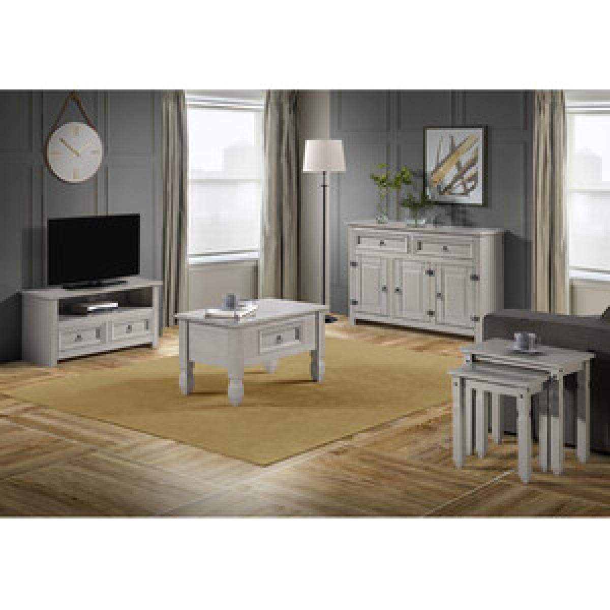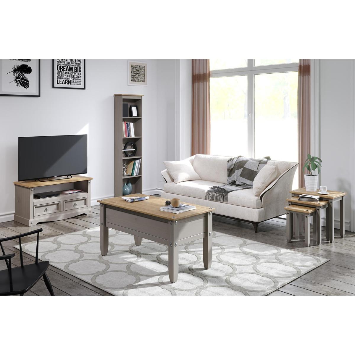 Add a touch of rustic charm to your room with this Corona Grey Washed Coffee Table. Its exposed gun metal grey studs give this piece a stunning rustic look. The long, sturdy waxed table top beautifully contrasts with the grey washed carcase, giving this piece a contemporary look that will complement all your interior decor styles with ease.
