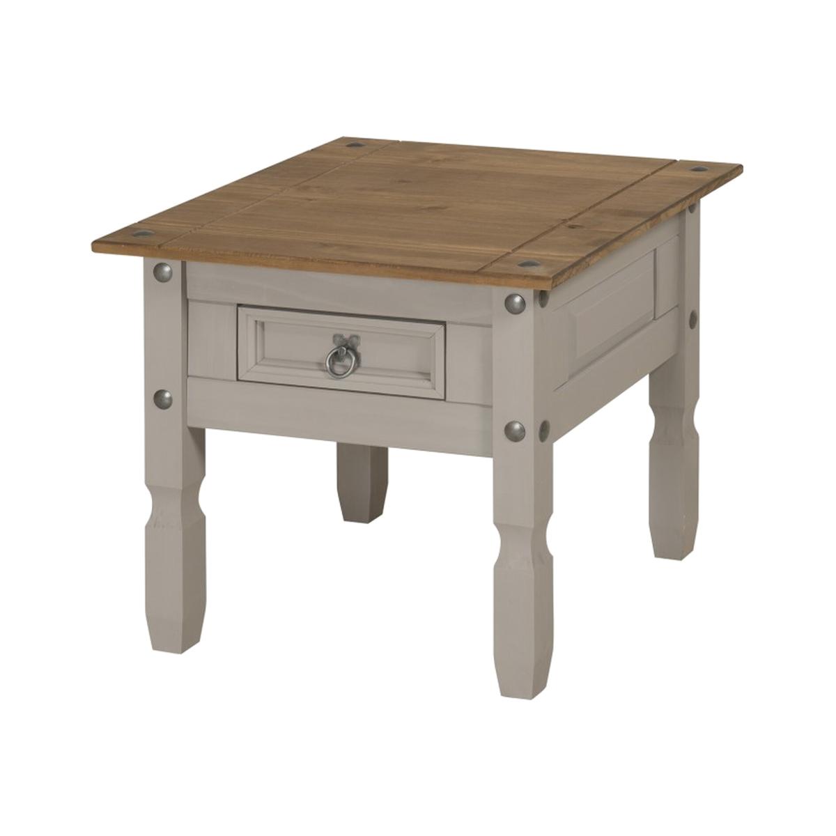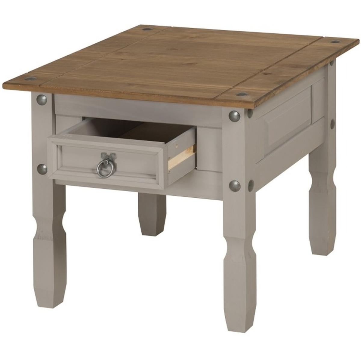 Mercers Furniture is happy to offer this Corona Grey Wax 1 Drawer Lamp Table, with a subtle grey wash body that allows the natural grains and textures of the wood to show through it offers a beautiful modern twist on a classic design while retaining all the characteristics that Corona is known and loved for. The item is expertly crafted from solid pine and hand waxed to protect, preserve as well as enhance the grain. With a drawer for extra storage the lamp table offers outstanding value for money that would be a welcome addition to any home. Finished off with decorative metal fittings which give the item its distinctive Mexican styling and offers that warm rustic country charm. The item has a harboard drawer base and is delivered flat packed for easy home assembly with step-by-step instructions.