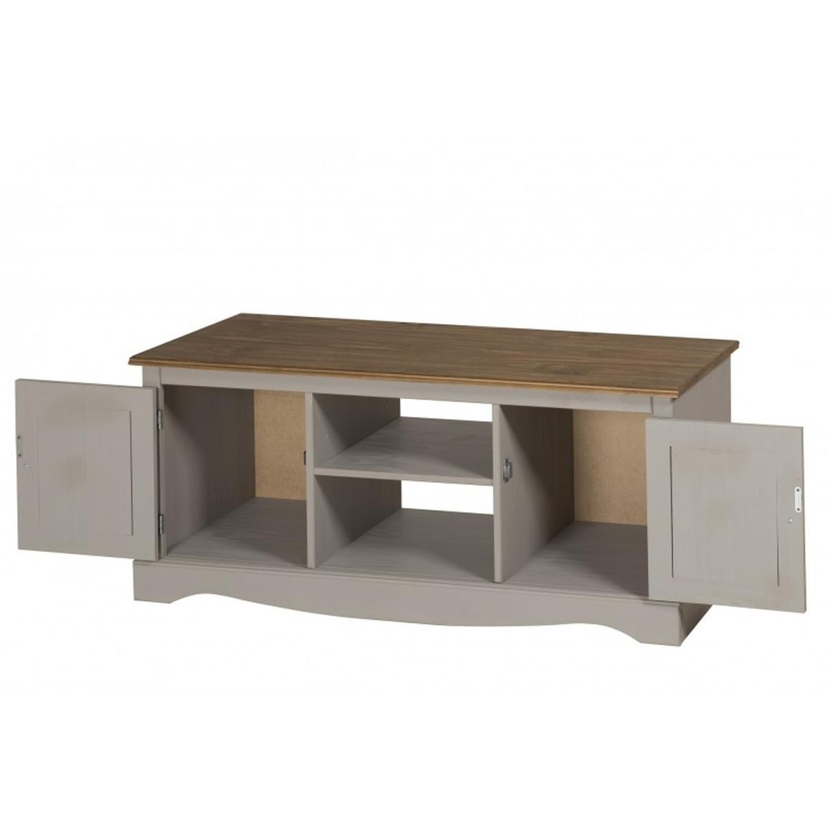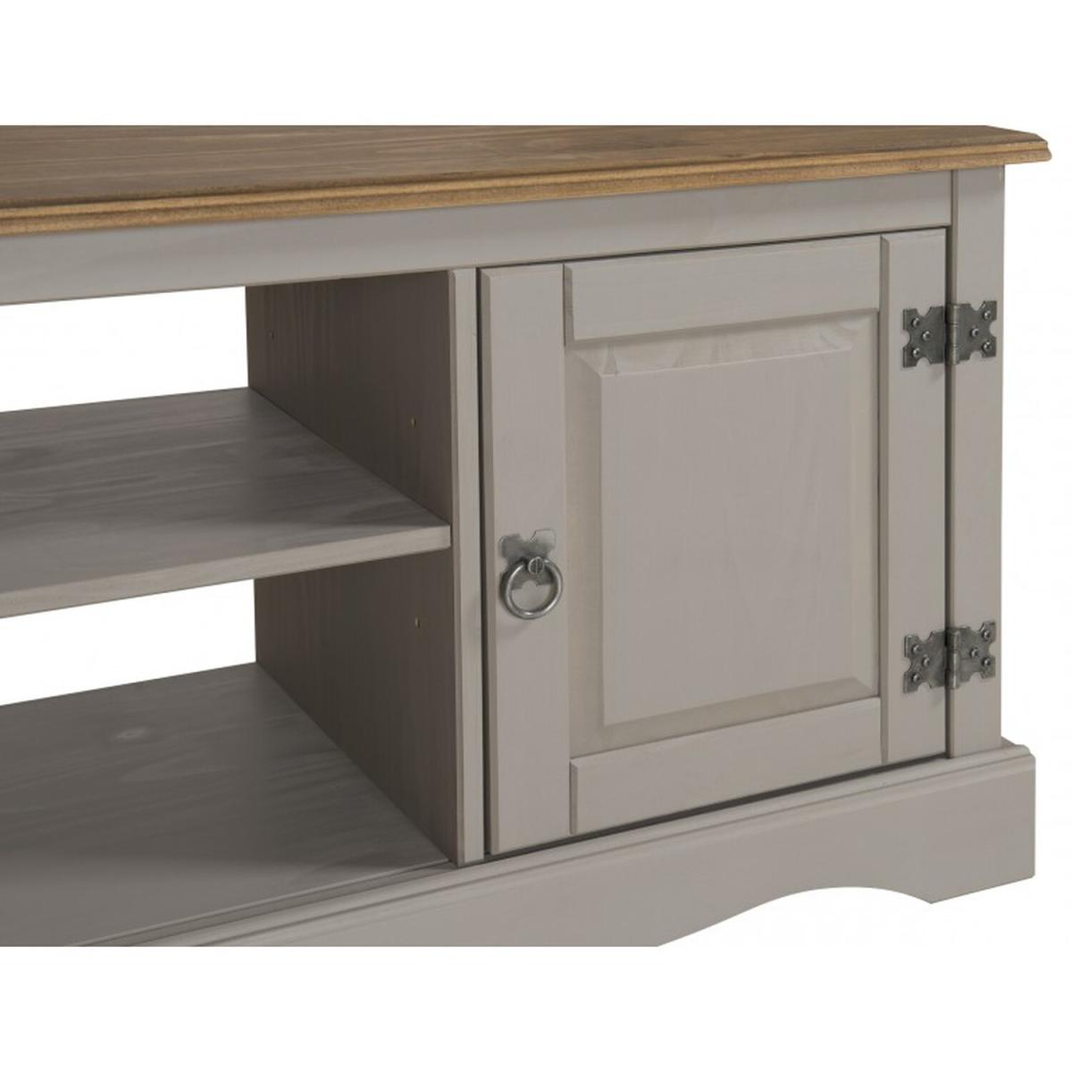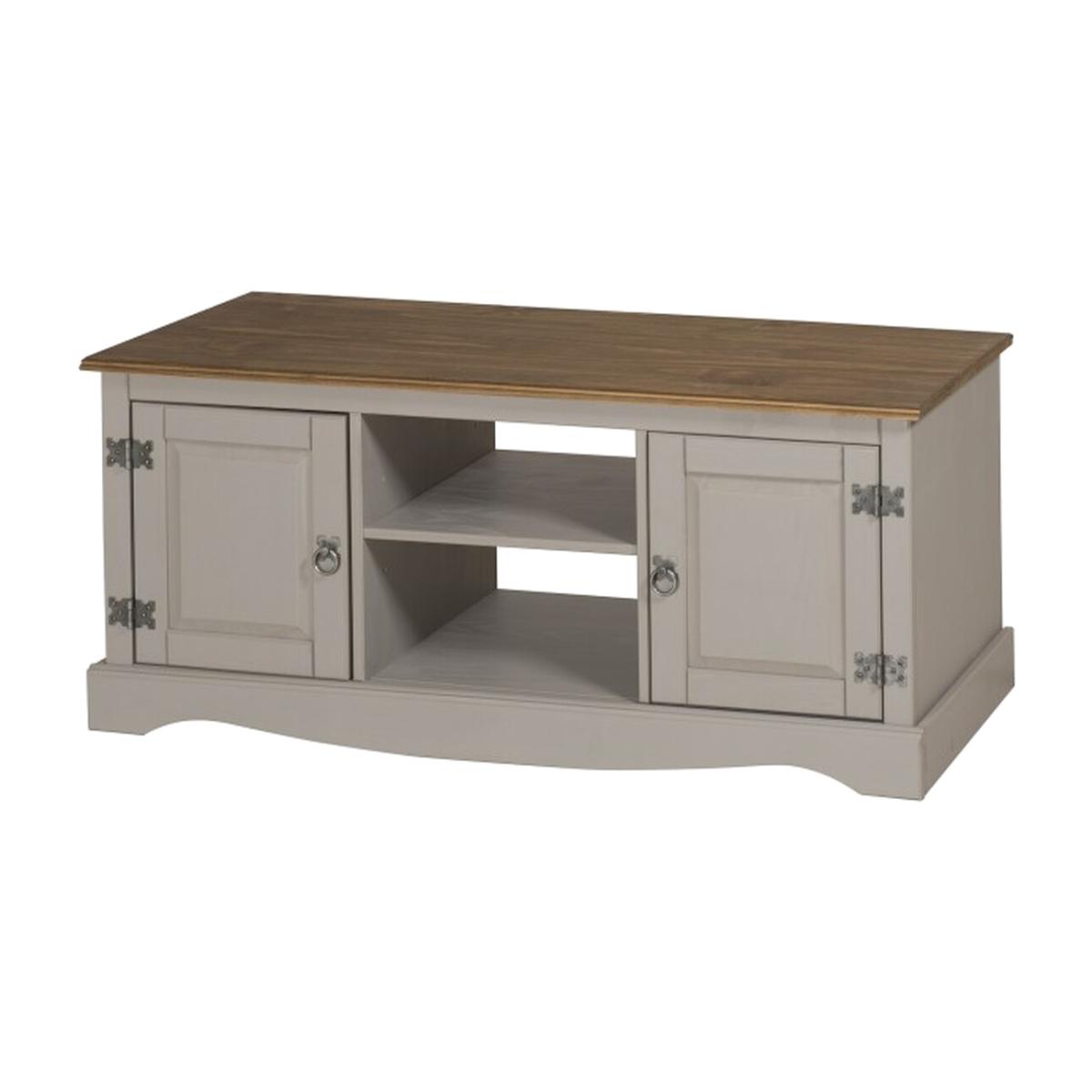 Mercers Furniture is happy to offer this Corona Grey Wax 2 Door Media Unit, with a subtle grey wash body that allows the natural grains and textures of the wood to show through it offers a beautiful modern twist on a classic design while retaining all the characteristics that Corona is known and loved for. The item is expertly crafted from solid pine and hand waxed to protect, preserve as well as enhance the grain. With open shelves as well as a 2 door cupboard for extra storage the TV unit offers outstanding value for money that would be a welcome addition to any home. Finished off with decorative metal fittings which give the item its distinctive Mexican styling and offers that warm rustic country charm. The item has harboard back and is delivered flat packed for easy home assembly with step-by-step instructions. Height - 52cm. Width - 115cm. Depth - 40cm