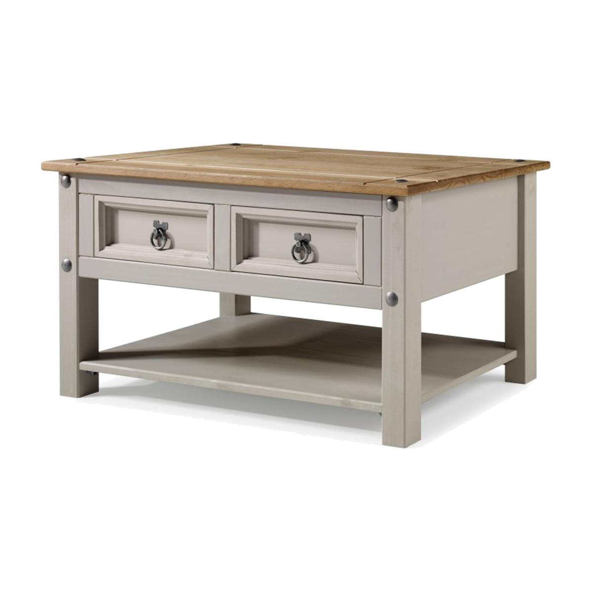 Mercers Furniture is happy to offer this Corona Grey Wax 2 Drawer Coffee Table, with a subtle grey wash body that allows the natural grains and textures of the wood to show through it offers a beautiful modern twist on a classic design while retaining all the characteristics that Corona is known and loved for. The item is expertly crafted from solid pine and hand waxed to protect, preserve as well as enhance the grain. With 2 drawers for extra storage the coffee table offers outstanding value for money that would be a welcome addition to any home. Finished off with decorative metal fittings which give the item its distinctive Mexican styling and offers that warm rustic country charm. The item has a harboard drawer base and is delivered flat packed for easy home assembly with step-by-step instructions.