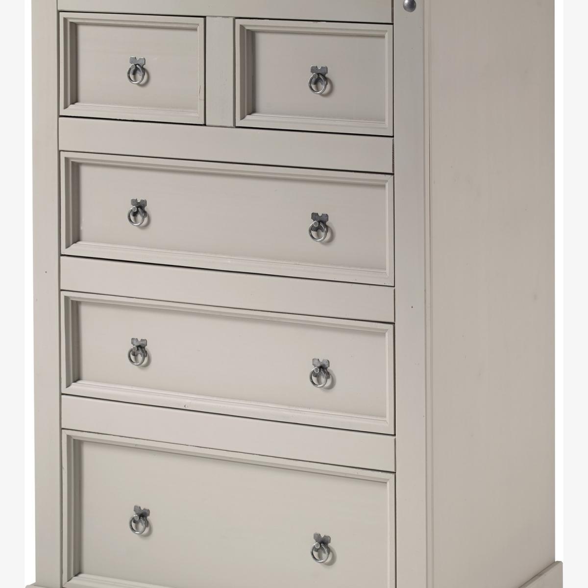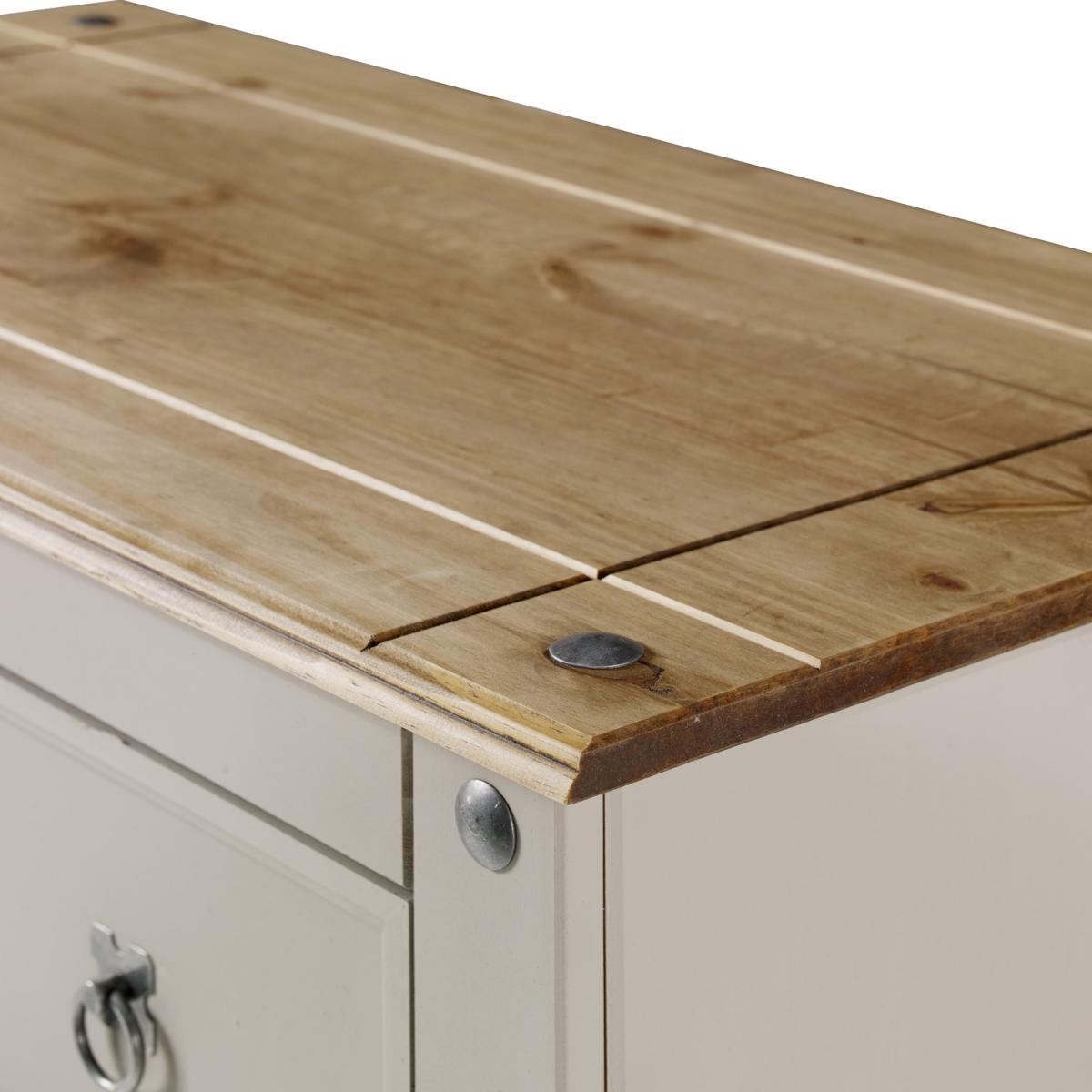 Mercers Furniture is happy to offer this Corona Grey Wax 23 Chest, with a subtle grey wash body that allows the natural grains and textures of the wood to show through it offers a beautiful modern twist on a classic design while retaining all the characteristics that Corona is known and loved for. The item is expertly crafted from solid pine and hand waxed to protect, preserve as well as enhance the grain. With 5 drawers it offers outstanding value for money that would be a welcome addition to any home. Finished off with decorative metal fittings which give the item its distinctive Mexican styling and offers that warm rustic country charm. The item has hardboard backs and drawer bases, its delivered flat packed for easy home assembly with step-by-step instructions. Height - 129cm. Width - 92cm. Depth - 48cm