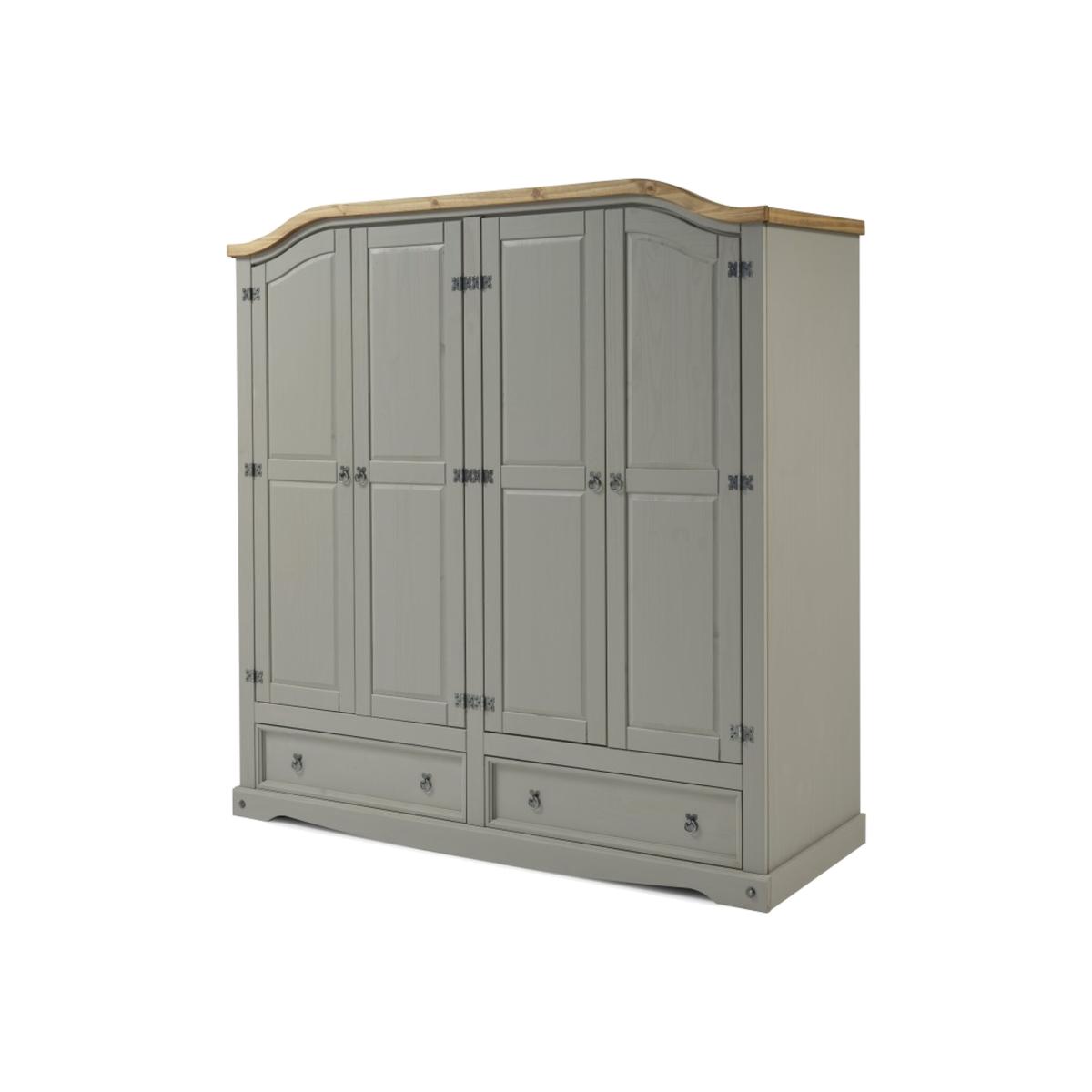 Mercers Furniture is happy to offer this Corona Grey Wax 4 Door 2 Drawer Arch Top Robe, with a subtle grey wash body that allows the natural grains and textures of the wood to show through it offers a beautiful modern twist on a classic design while retaining all the characteristics that Corona is known and loved for. The wardrobe is expertly crafted from solid pine and hand waxed to protect, preserve as well as enhance the grain. It offers outstanding value for money that would be a welcome addition to any bedroom, finished off with decorative metal fittings which give the item its distinctive Mexican styling and offers that warm rustic country charm. The item has hardboard backboards and is delivered flat packed for easy home assembly with step-by-step instructions.