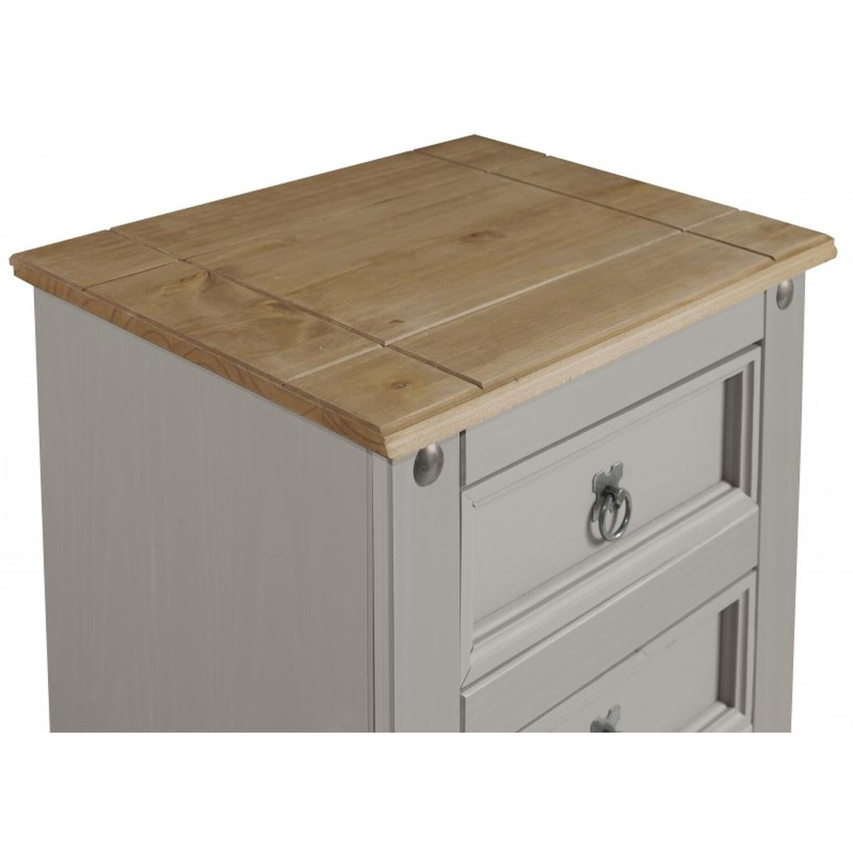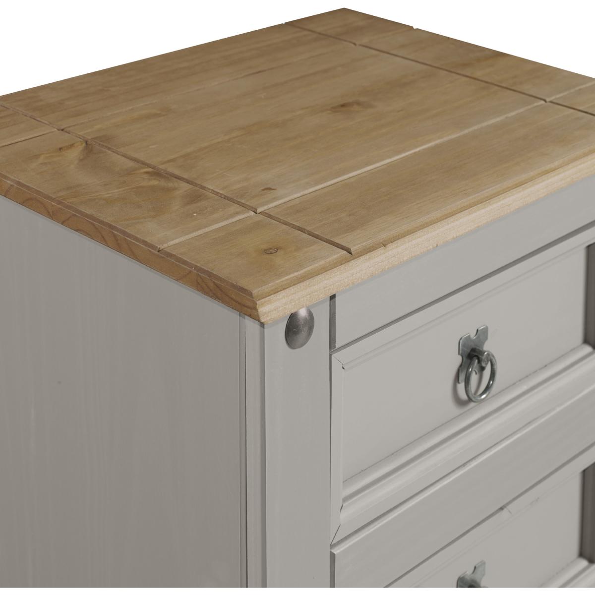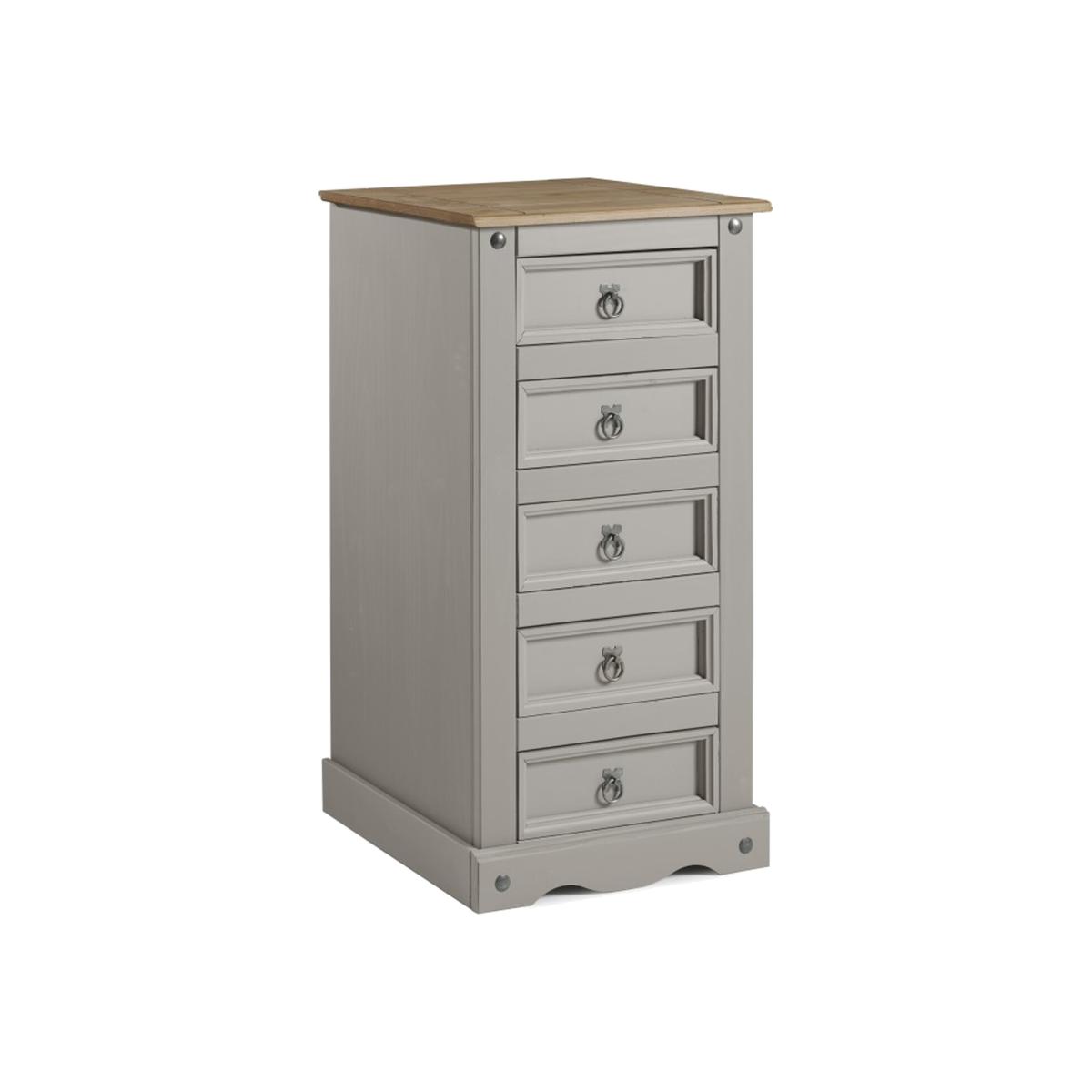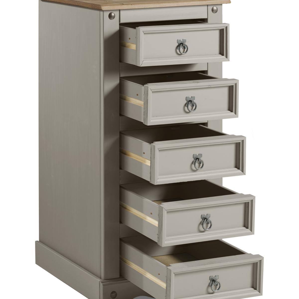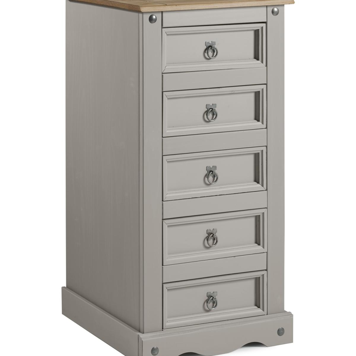 Mercers Furniture is happy to offer this Corona Grey Wax 5 Drawer Narrow Chest, with a subtle grey wash body that allows the natural grains and textures of the wood to show through it offers a beautiful modern twist on a classic design while retaining all the characteristics that Corona is known and loved for. The item is expertly crafted from solid pine and hand waxed to protect, preserve as well as enhance the grain. With 5 drawers it offers outstanding value for money that would be a welcome addition to any home. Finished off with decorative metal fittings which give the item its distinctive Mexican styling and offers that warm rustic country charm. The item has hardboard backs and drawer bases, its delivered flat packed for easy home assembly with step-by-step instructions. Height - 103cm. Width - 53cm. Depth - 39cm