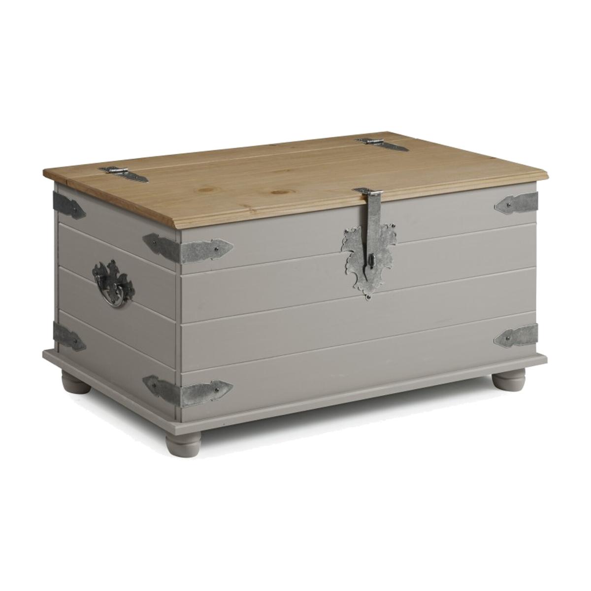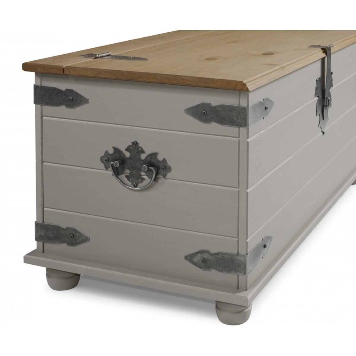 Mercers Furniture is happy to offer this Corona Grey Wax Blanket Box, with a subtle grey wash body that allows the natural grains and textures of the wood to show through it offers a beautiful modern twist on a classic design while retaining all the characteristics that Corona is known and loved for. The item is expertly crafted from solid pine and hand waxed to protect, preserve as well as enhance the grain. With ample storage the unit offers outstanding value for money that would be a welcome addition to any home. Finished off with decorative metal fittings which give the item its distinctive Mexican styling and offers that warm rustic country charm. The item is delivered flat packed for easy home assembly with step-by-step instructions. Height - 46cm. Width - 92cm. Depth - 45cm