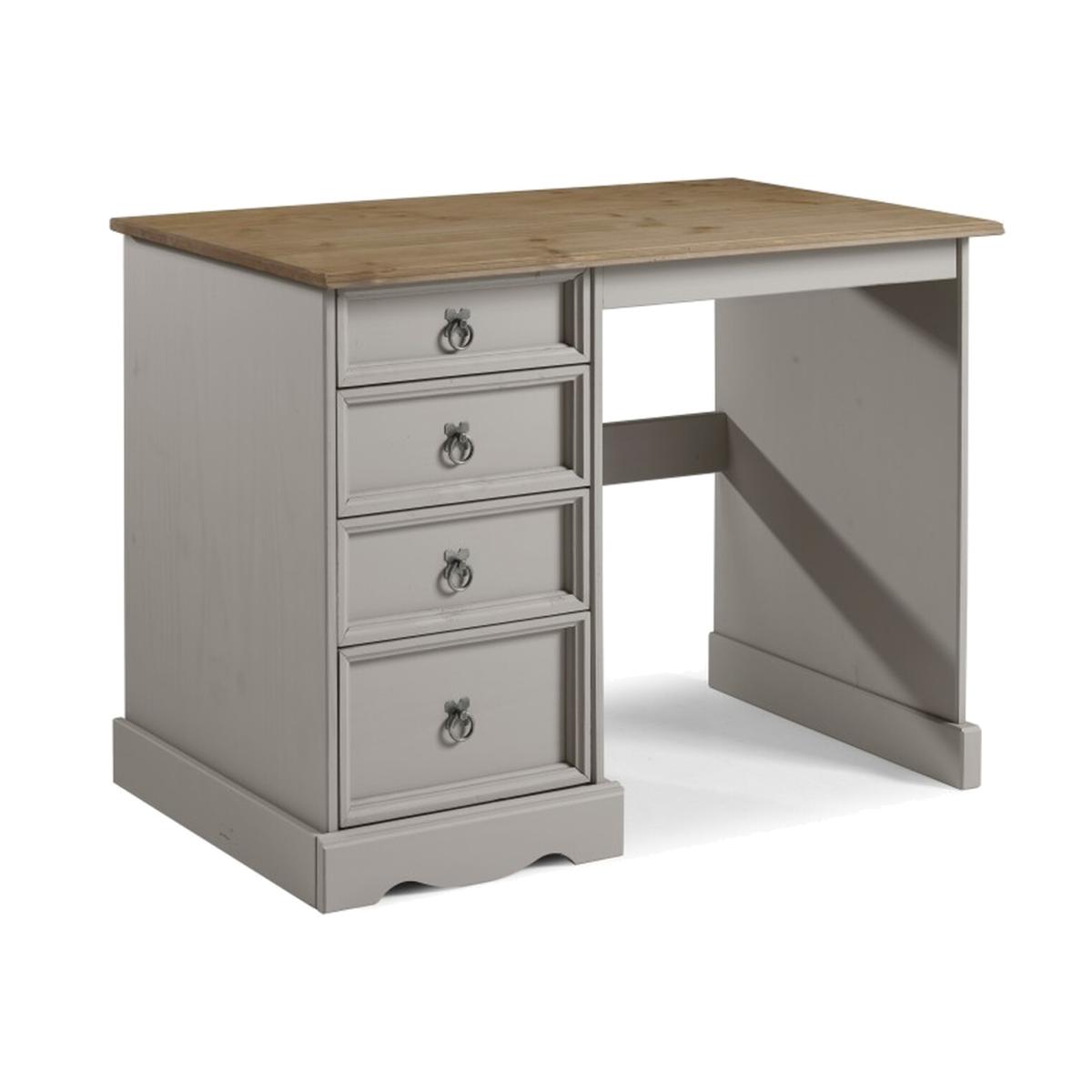 Mercers Furniture is happy to offer this Corona Dressing Table, expertly crafted from solid pine and hand waxed to preserve as well as enhance the grain. It offers outstanding value for money that would be a welcome addition to any home. Includes 4 drawers for extra storage the item is finished off with black metal fittings which give a distinctive Mexican styling and offers that warm rustic country charm. The item has hardboard backs and drawer bases, its delivered flat packed for easy home assembly with step-by-step instructions. Height - 77cm. Width - 105cm Depth - 49cm Mercers Furniture is happy to offer this Corona Grey Wax Dressing Table, with a subtle grey wash body that allows the natural grains and textures of the wood to show through it offers a beautiful modern twist on a classic design while retaining all the characteristics that Corona is known and loved for. The item is expertly crafted from solid pine and hand waxed to protect, preserve as well as enhance the grain. With 4 drawers for extra storage the unit offers outstanding value for money that would be a welcome addition to any home. Finished off with decorative metal fittings which give the item its distinctive Mexican styling and offers that warm rustic country charm. The item has harboard backs and drawer bases, its delivered flat packed for easy home assembly with step-by-step instructions. Height - 77cm. Width - 105cm Depth - 49cm