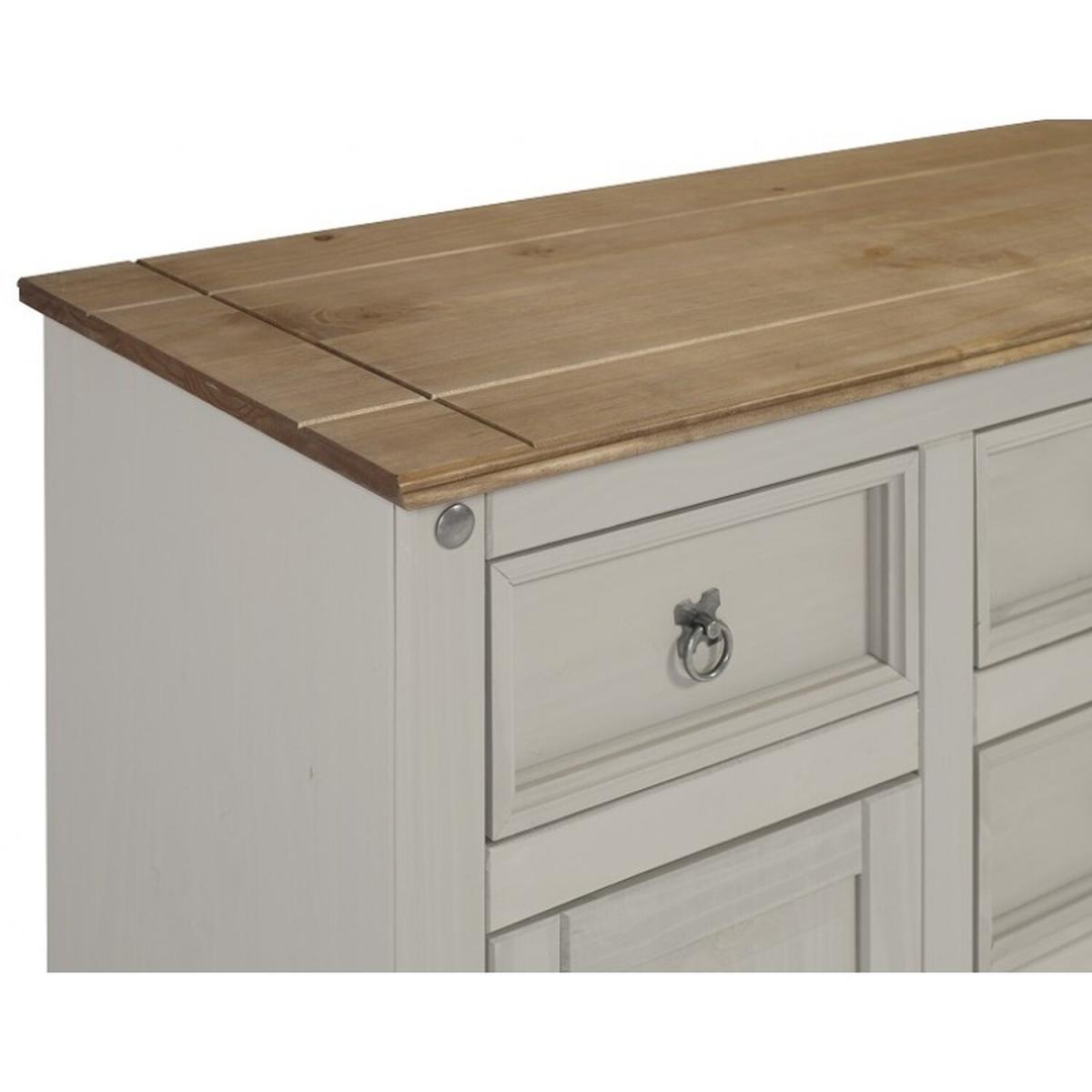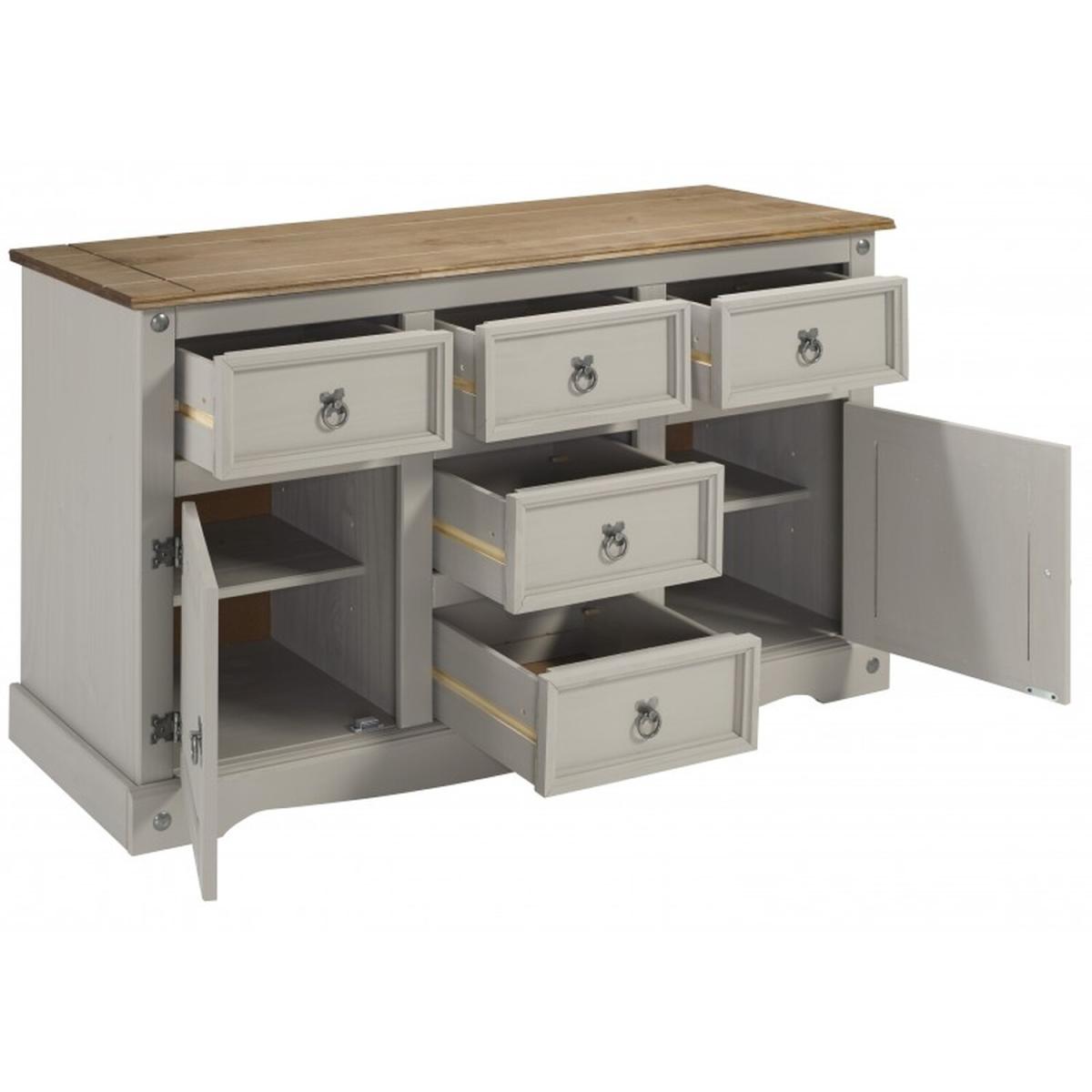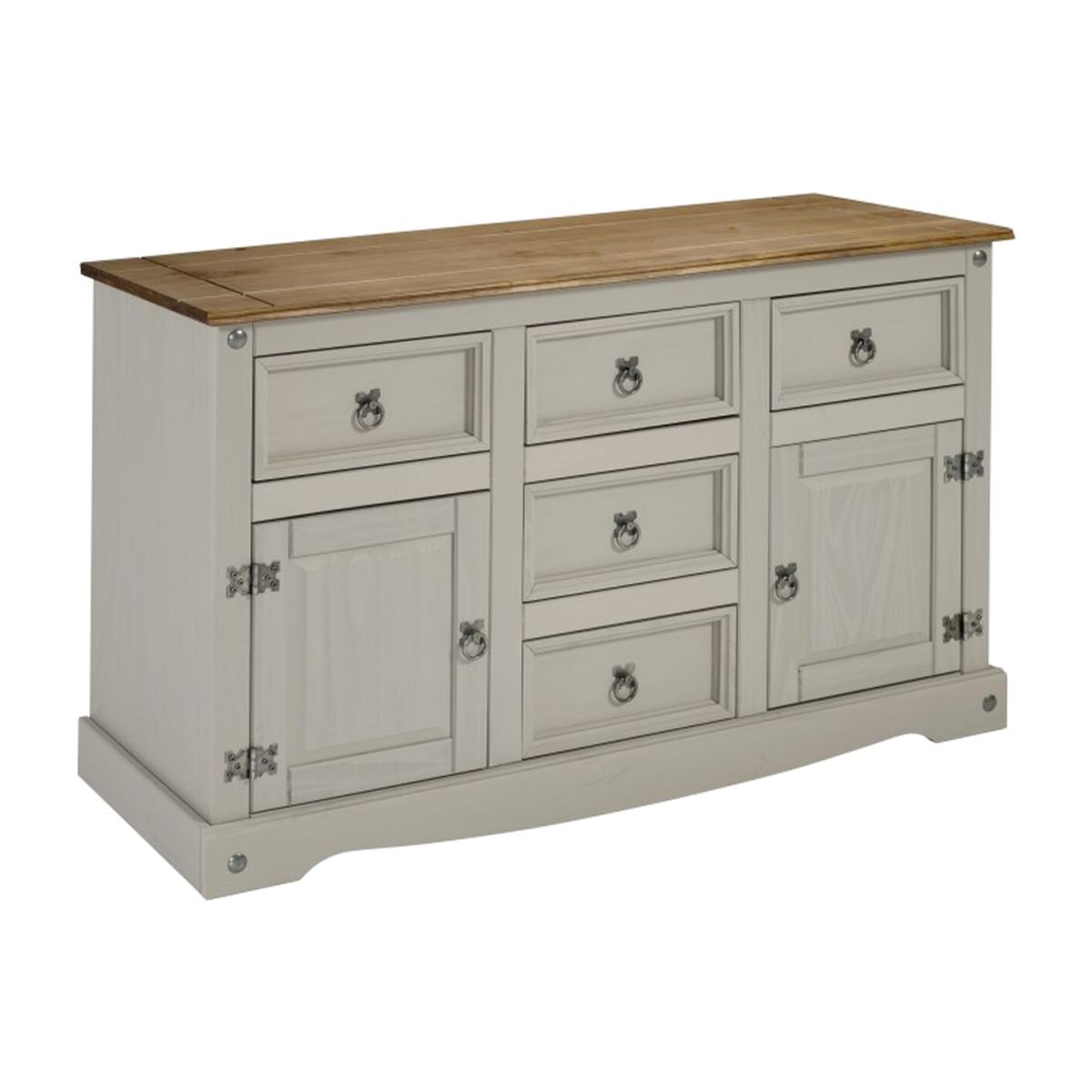 Mercers Furniture is happy to offer this Corona Grey Wax Large Sideboard, with a subtle grey wash body that allows the natural grains and textures of the wood to show through it offers a beautiful modern twist on a classic design while retaining all the characteristics that Corona is known and loved for. The item is expertly crafted from solid pine and hand waxed to protect, preserve as well as enhance the grain. With an 2 doors and 5 drawers for extra storage the unit offers outstanding value for money that would be a welcome addition to any home. Finished off with decorative metal fittings which give the item its distinctive Mexican styling and offers that warm rustic country charm. The item has harboard backs and drawer bases, its delivered flat packed for easy home assembly with step-by-step instructions. Height - 76cm. Width - 125cm Depth - 40cm