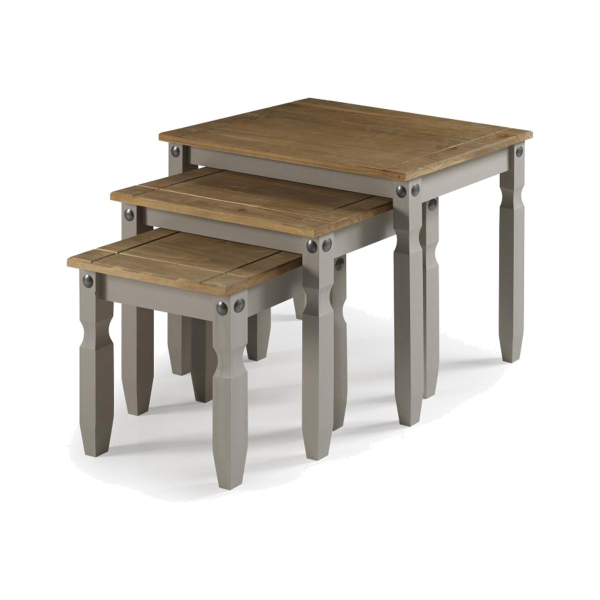 Mercers Furniture is happy to offer this Corona Grey Wax Nest of Tables, with a subtle grey wash body that allows the natural grains and textures of the wood to show through it offers a beautiful modern twist on a classic design while retaining all the characteristics that Corona is known and loved for. The item is expertly crafted from solid pine and hand waxed to protect, preserve as well as enhance the grain. The nest of tables offers outstanding value for money that would be a welcome addition to any home. Finished off with decorative metal fittings which give the item its distinctive Mexican styling and offers that warm rustic country charm. The item is delivered flat packed for easy home assembly with step-by-step instructions.