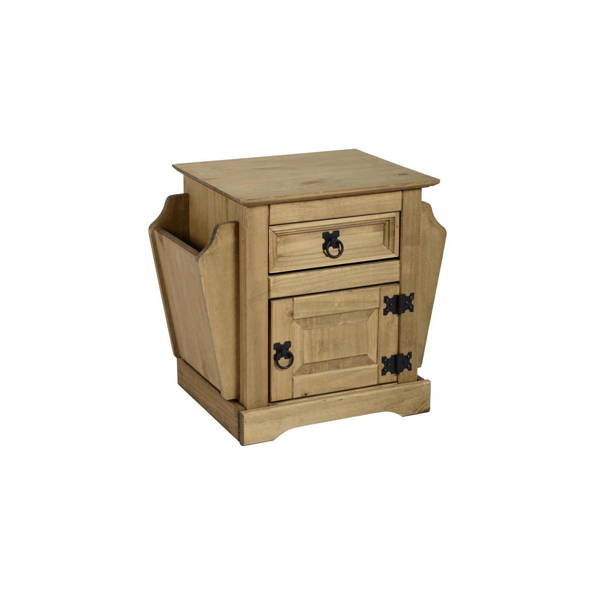 The Corona range of solid pine furniture offers excellent value for money. The Mexican influence in the design and style creates a range that would be at home in a variety of settings. All items in this range are stained to reproduce the classic look of Mexican pine furniture with the wood being protected by a light wax. Metal fittings are used which further complement the looks of this stylish rustic furniture. Features two niches on the left and right hand sides, ideal for your magazines and also has one drawer and one cupboard for extra storage space. Perfect for organising your magazines and newspapers. Please note, unfortunately we cannot deliver this item to the Channel Islands.