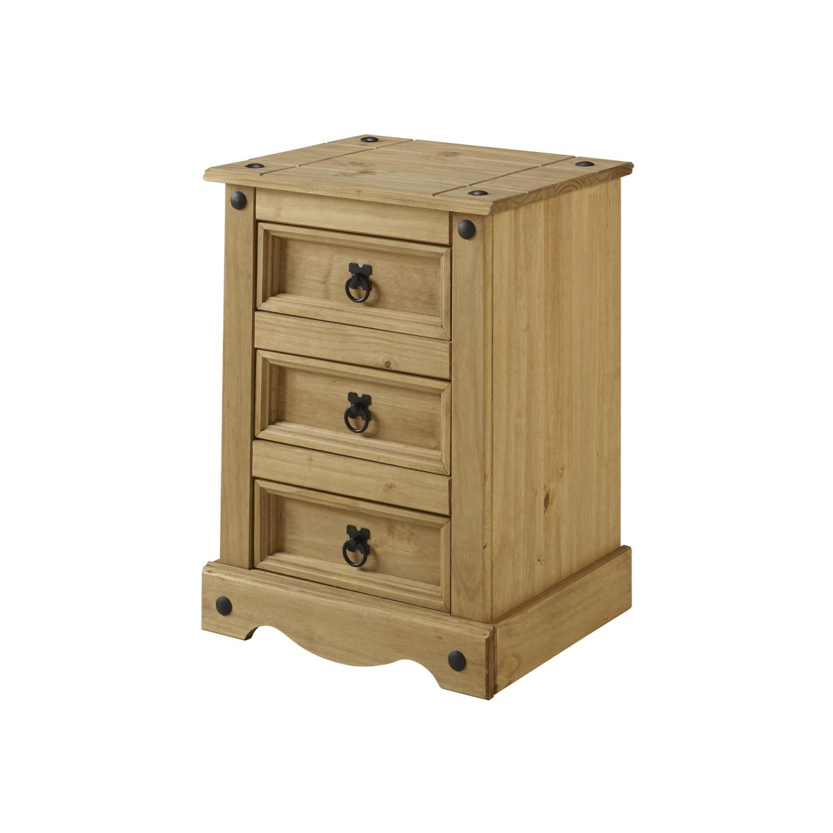 Mercers Furniture is happy to offer this Corona 3 Drawer Bedside, the bedside is expertly crafted from solid pine and hand waxed to preserve as well as enhance the grain. It offers outstanding value for money with 3 drawers that would be a welcome addition to any bedroom. It is finished off with black metal fittings which give the item its distinctive Mexican styling and offers that warm rustic country charm. The item has hardboard backs and drawer bases, its delivered flat packed for easy home assembly with step-by-step instructions.