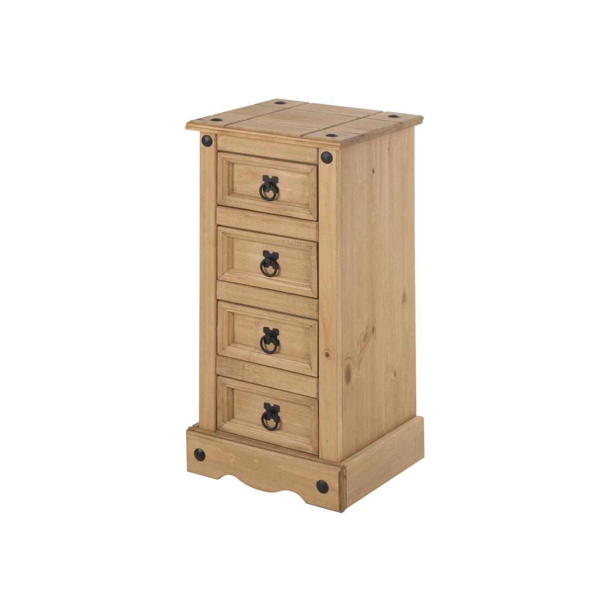 Mercers Furniture is happy to offer this Corona Narrow 4 Drawer Bedside, the bedside is expertly crafted from solid pine and hand waxed to preserve as well as enhance the grain. It offers outstanding value for money with 4 drawers that would be a welcome addition to any bedroom. It is finished off with black metal fittings which give the item its distinctive Mexican styling and offers that warm rustic country charm. The item has hardboard backs and drawer bases, its delivered flat packed for easy home assembly with step-by-step instructions.