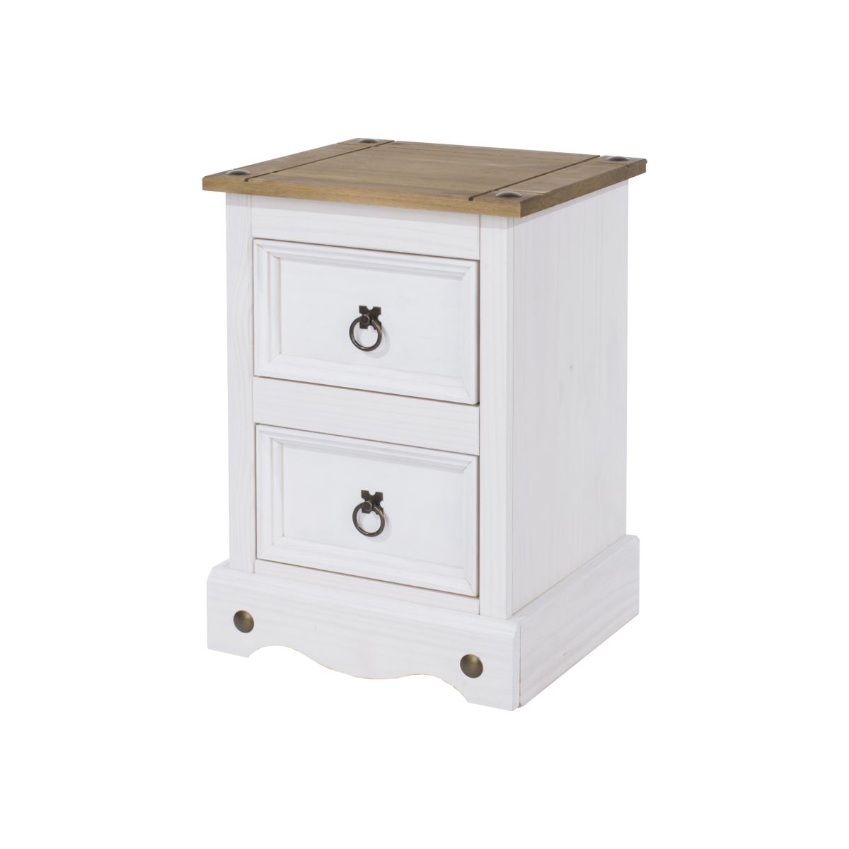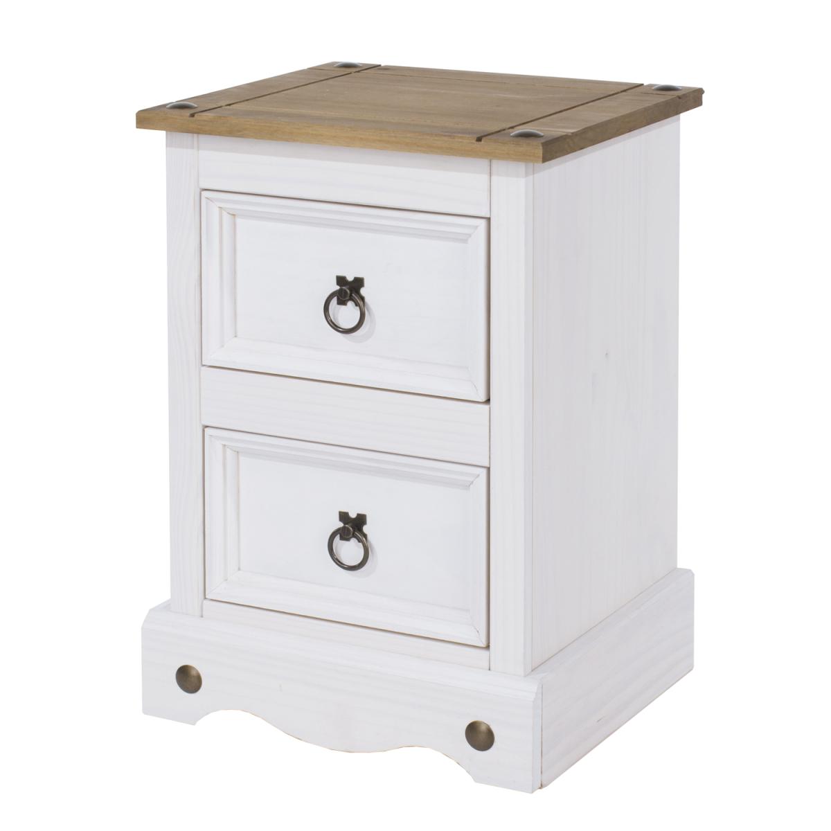 The perfect piece for beside your bed, this Corona Petite Bedside Cabinet keeps your room looking neat and organised. Designed with a choice of a beautiful white washed wax finish or antique pine finish. This cabinet is made with two spacious drawers for your belongings and enough table space for a lamp or other decorations. Great for any bedroom, this bedside cabinet is sure to be a welcome addition.