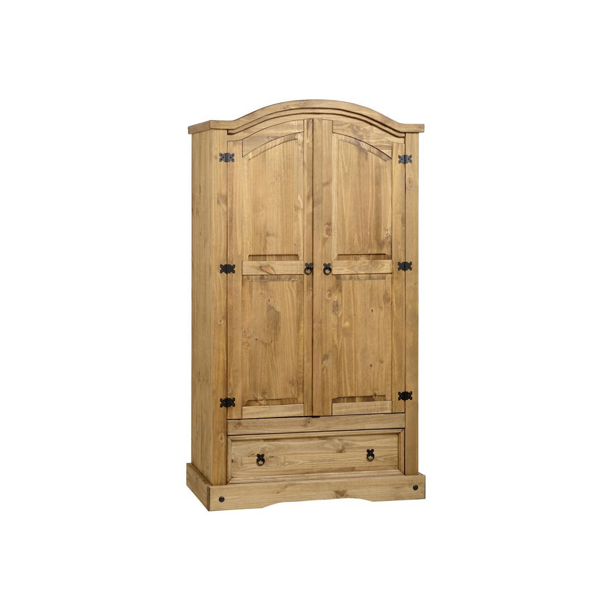 The Corona range of solid pine furniture offers excellent value for money. The Mexican influence in the design and style creates a range that would be at home in a variety of settings. All items in this range are stained to reproduce the classic look of Mexican pine furniture with the wood being protected by a light wax. Metal fittings are used which further complement the looks of this stylish rustic furniture. Curved top style with 2 doors featuring a hanging rail with a shelf above in the centre and 1 drawer for extra storage. Please note, unfortunately we cannot deliver this item to the Channel Islands.