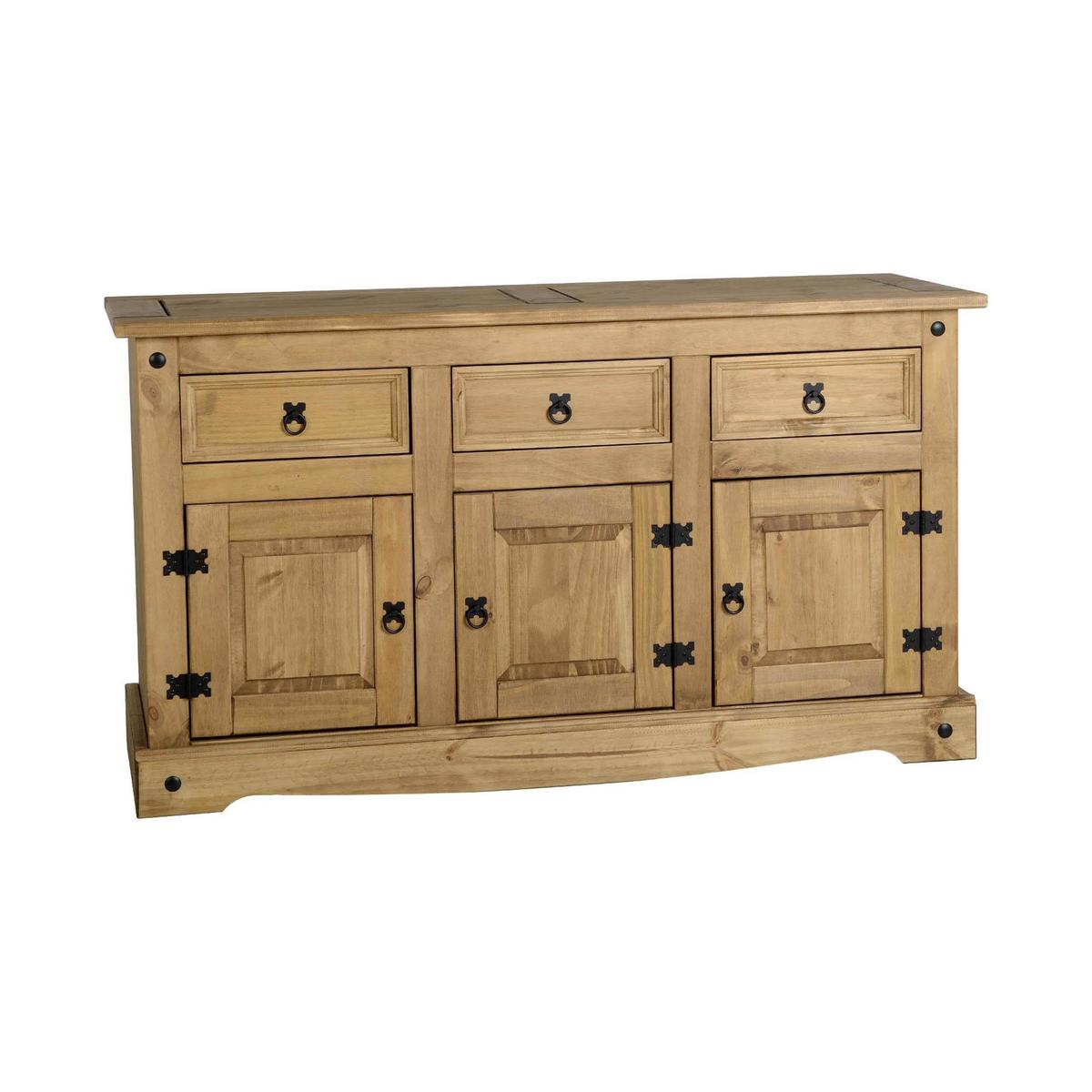 Designed with a natural colour tone and a vintage look, this self-assembly sideboard features an ample storage space with three drawers and three doors. With a hand waxed, Mexican inspired finish and distinct black metal handles and hinges, this piece is just as practical as it is beautiful. Please note, unfortunately we cannot deliver this item to the Channel Islands.