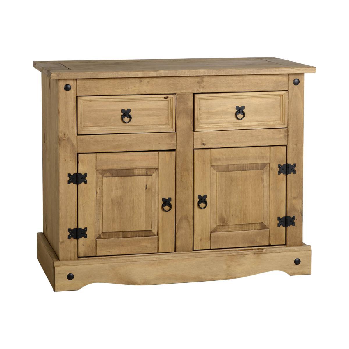 Designed with a natural colour tone and a vintage look, this self-assembly sideboard features an ample storage space with two drawers and two doors. With a hand waxed, Mexican inspired finish and distinct black metal handles and hinges, this piece is just as practical as it is beautiful.