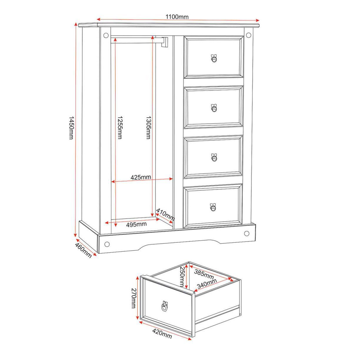The Seconique Corona 1 Door 4 Drawer Wardrobe boasts ample storage with drawer room and hanging space too. This beautiful distressed waxed pine wardrobe will bring a whole new look to your home. The attractive design with metal drop handles and the rich colour of the wood make it a superb piece of furniture to look at that is also highly functional. With four spacious drawers and pine hanging rail behind the door, there’s plenty of room to store your belongings. Installation Note: This product should be fixed to a wall using a wall fastener. Please note, unfortunately we cannot deliver this item to the Channel Islands.