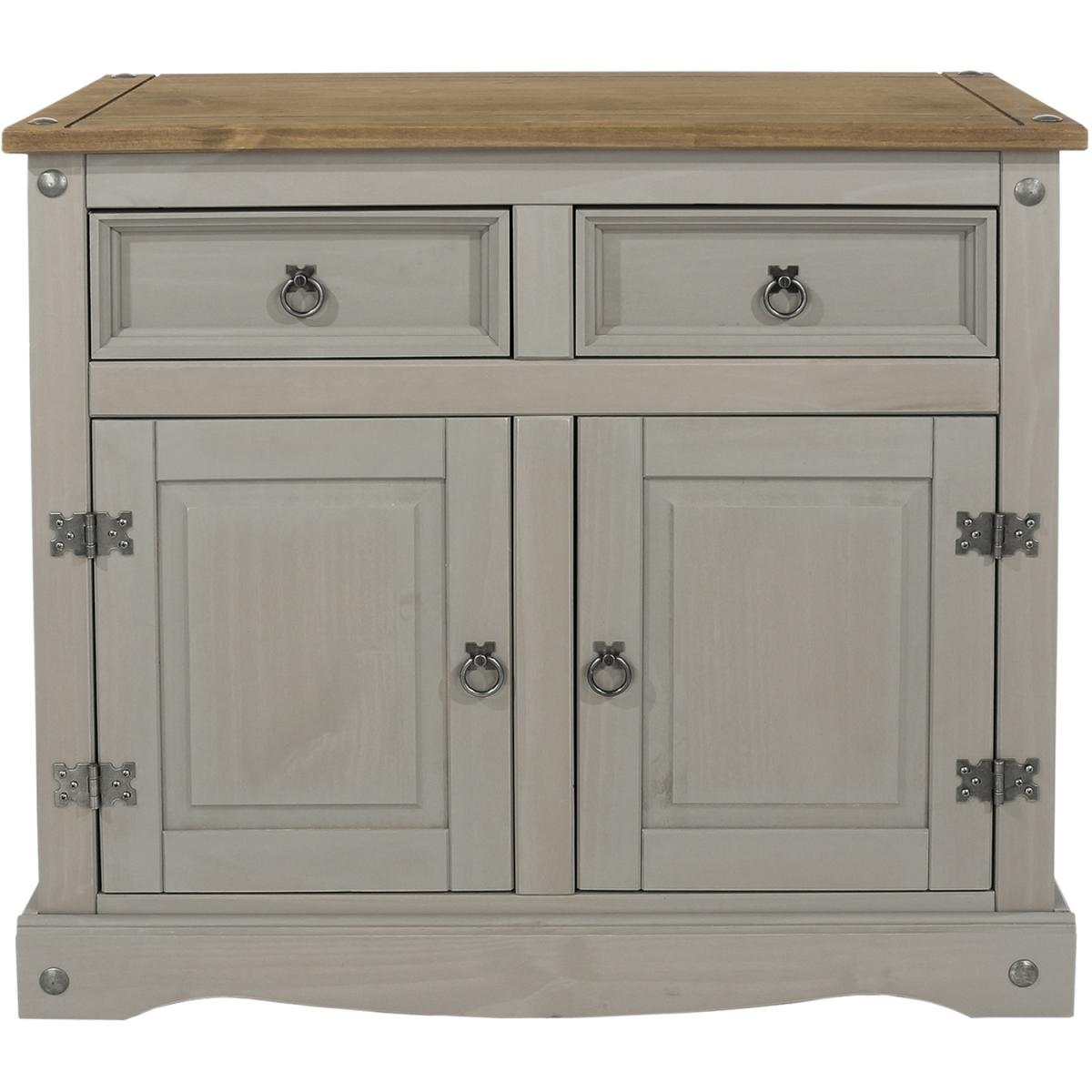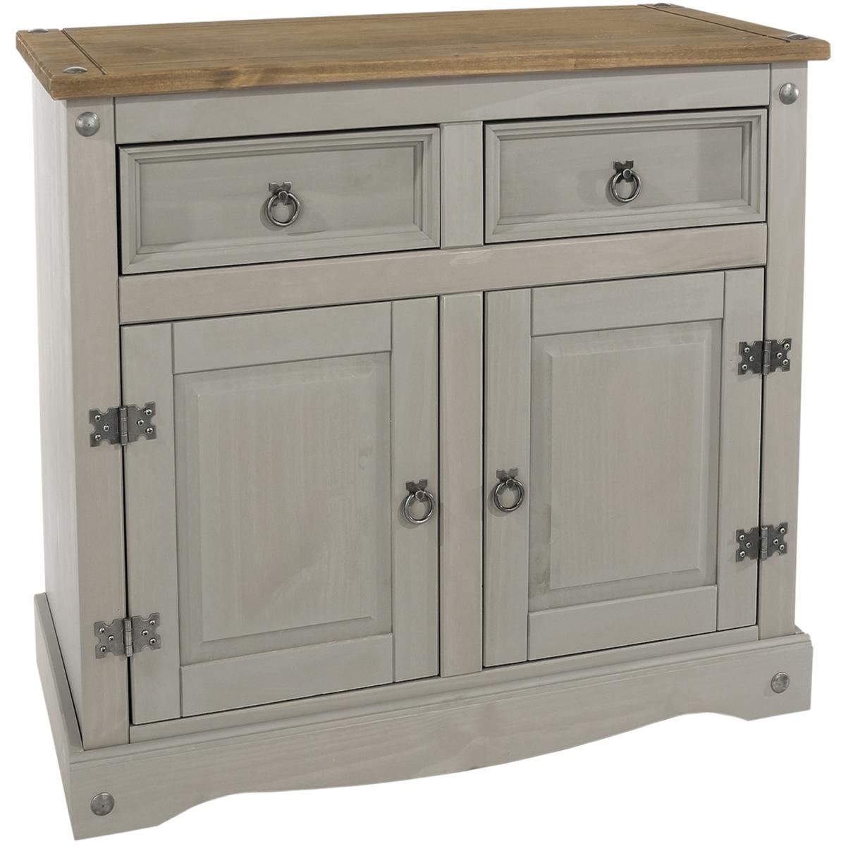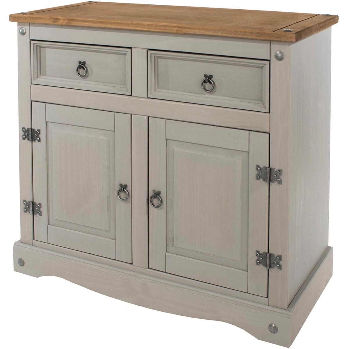 Crafted from pine the Corona Grey Small Sideboard boasts a traditional farmhouse design, offering ample storage space kept easily organised with two drawers and two cupboard doors.