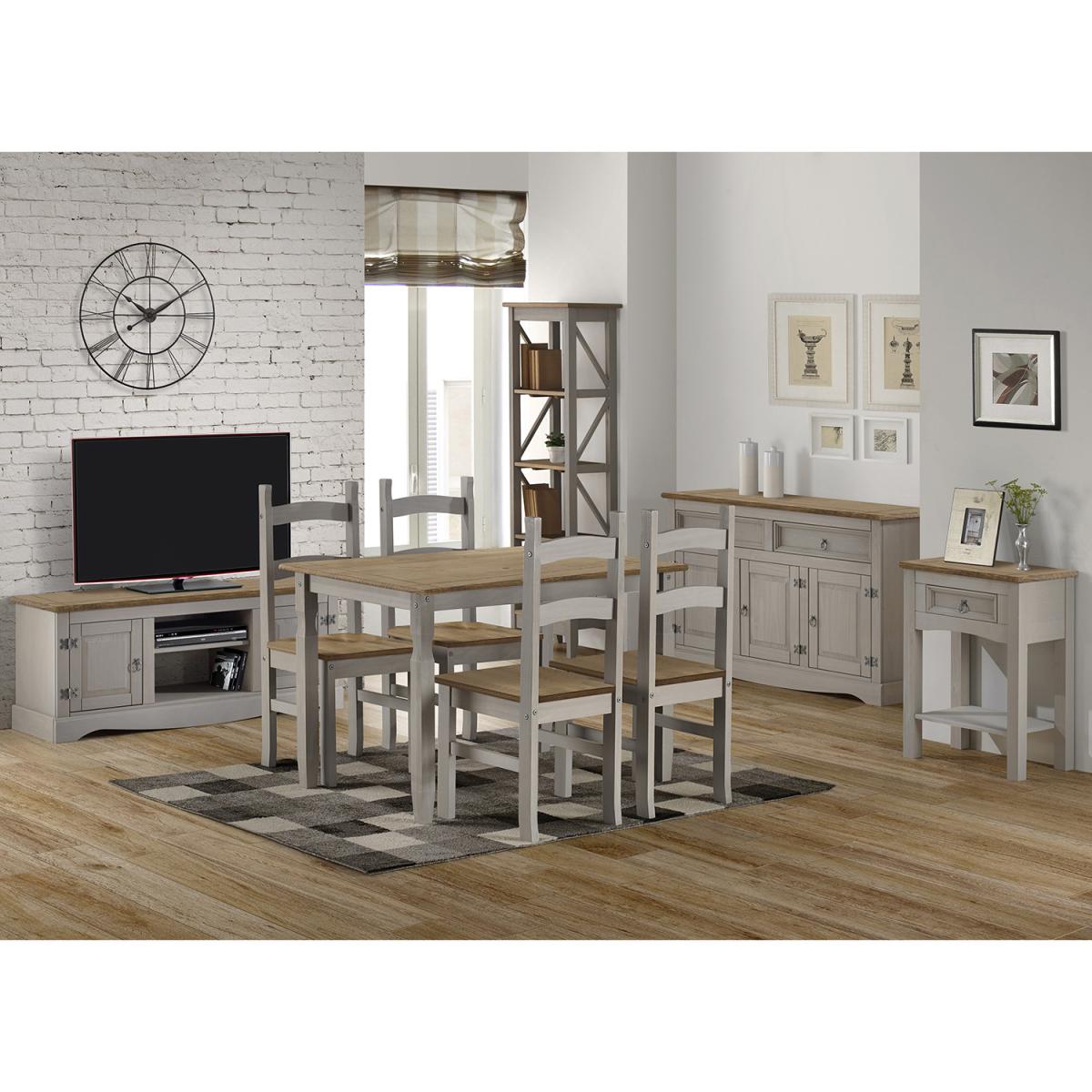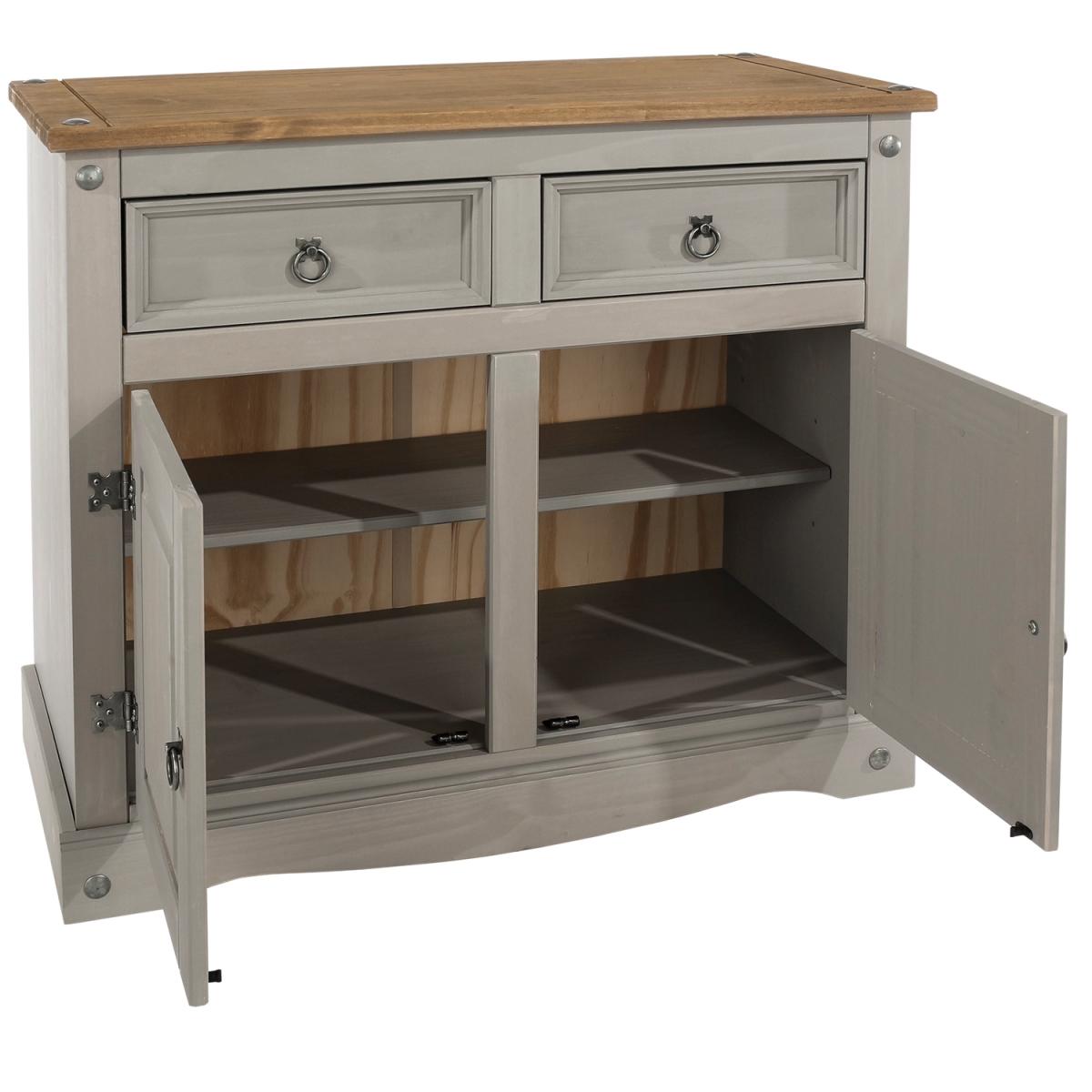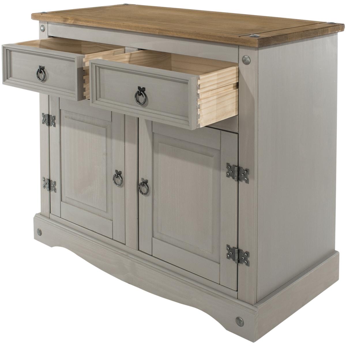 Crafted from pine the Corona Grey Small Sideboard boasts a traditional farmhouse design, offering ample storage space kept easily organised with two drawers and two cupboard doors.