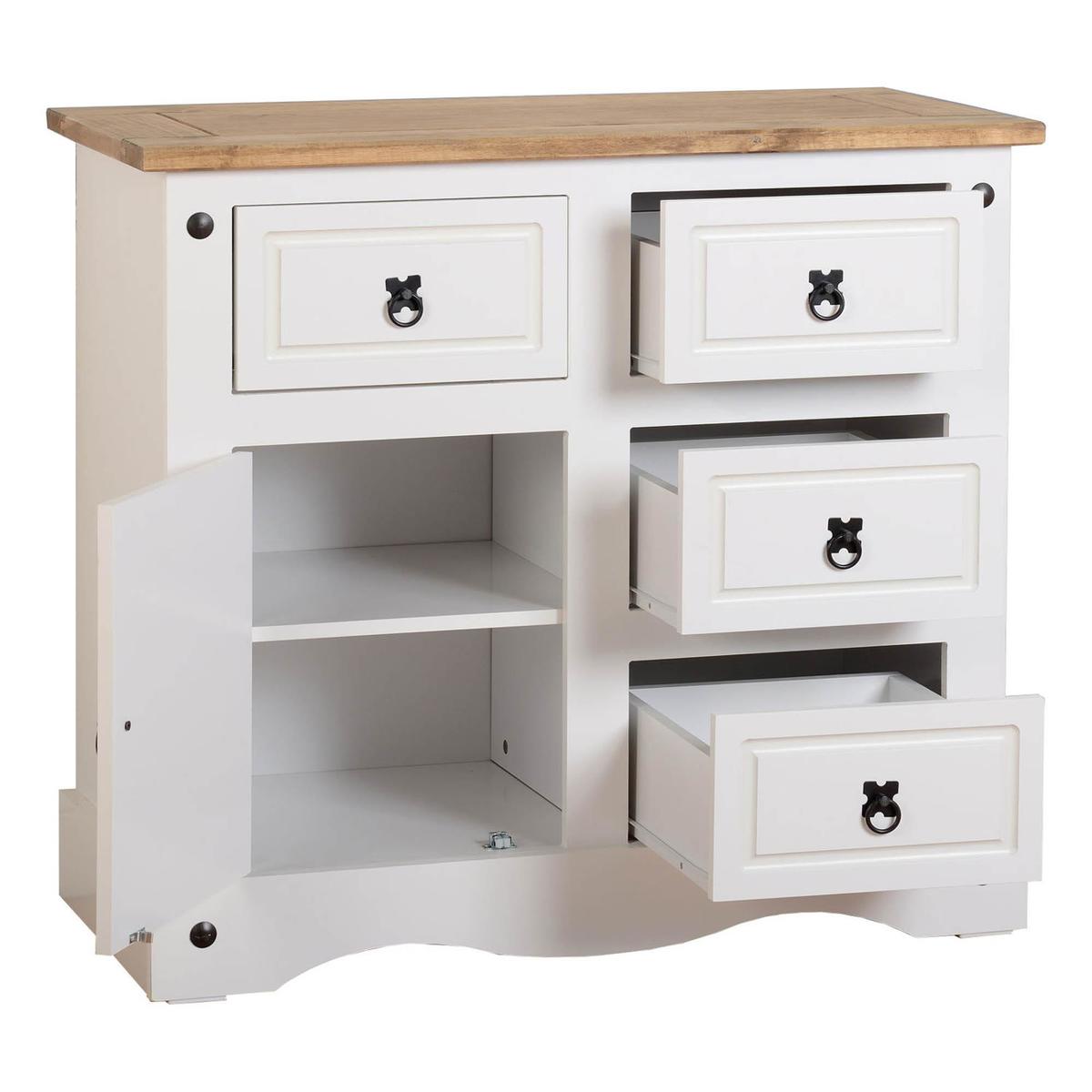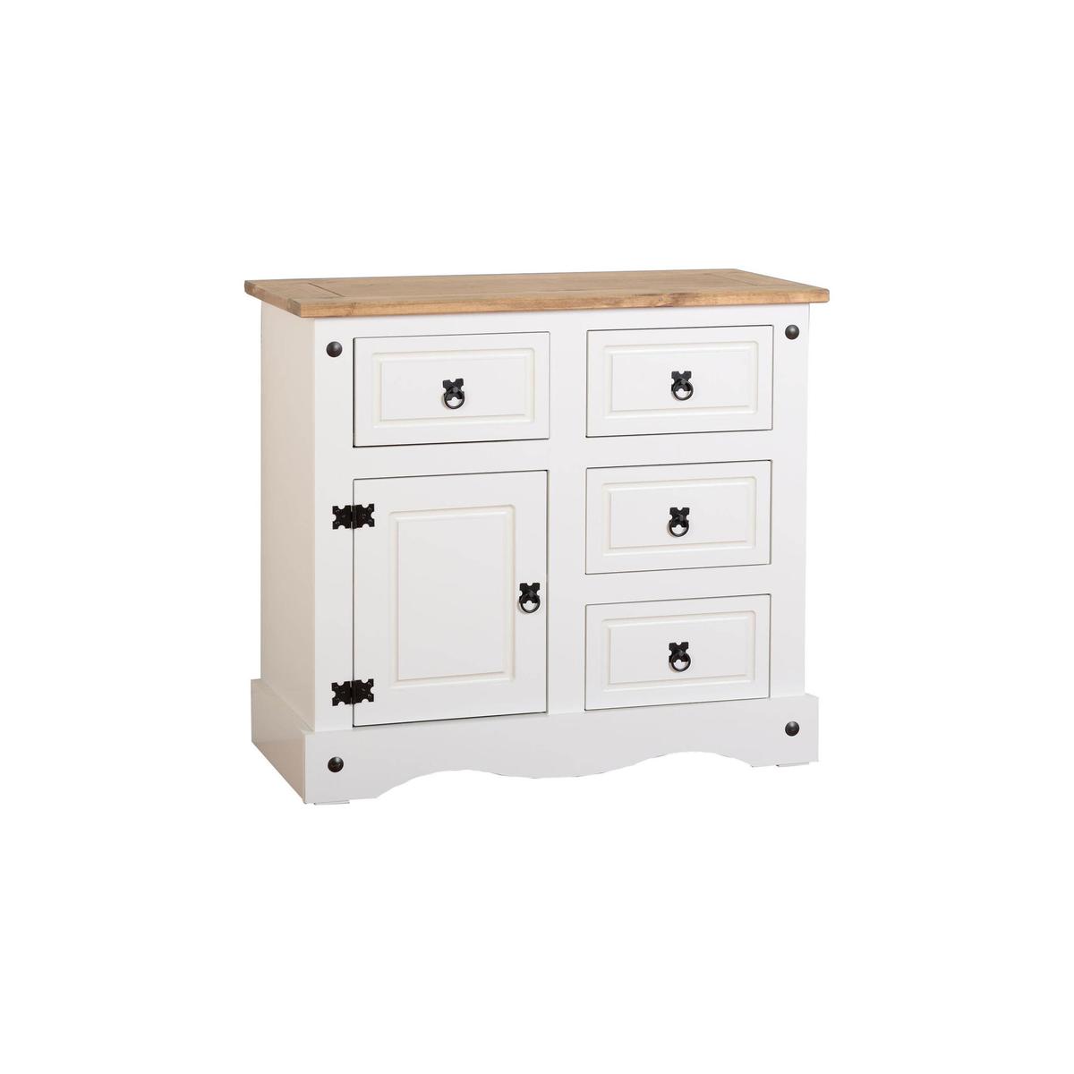 Crafted with high quality finish, this Corona sideboard features one door and four drawers and has a wonderful contrast finish that will brighten up any home. The white base works well with the pine top and black metal drop handles to complete the look of this piece which also has plenty of storage space for your belongings. Please note, unfortunately we cannot deliver this item to the Channel Islands.