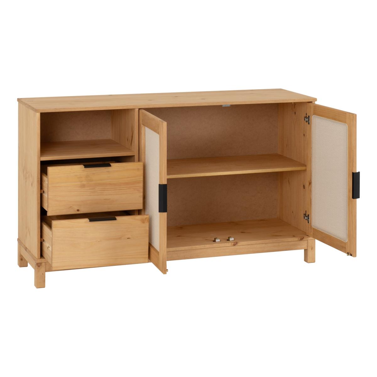 * Rustic Design* Rattan Drawer Fronts* Black Metal Hardware Crafted with a captivating rattan style and finished in beautifully distressed waxed pine, this sideboard exudes rustic elegance. Its ample storage space makes it not only a stylish addition to your decor but also a practical solution for keeping your belongings organized. Enhanced with black metal hardware, this piece strikes a perfect balance between classic and contemporary design.