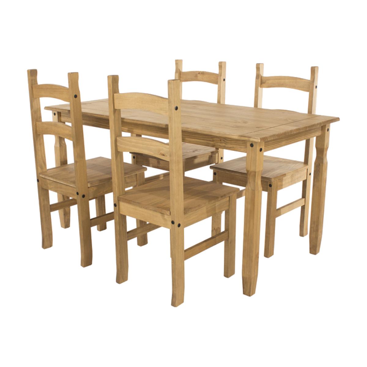 The Corona 1500mm Dining Set with 4 Chairs. Beautifully fashioned from pine, it offers a sturdy and durable addition to your home. This dining table can be adorned with seasonal blooms, table mats and table runners to create a delightful surface you can wine and dine in style on. Four chairs made of the same Mexican inspired design that can fit perfectly around the table. The whole set will be a welcome addition to your dining room and home. It is easy to assemble, meaning you can quickly construct this beautiful piece of furniture, ensuring you can relax in no time. The wax finish gives the table a contemporary feel that will brighten your home. Its classic and understated design will match any interior decor, adding a sophisticated style to any room it is placed in.