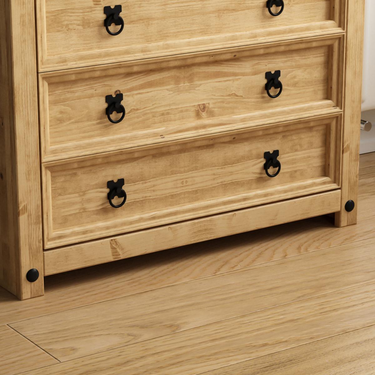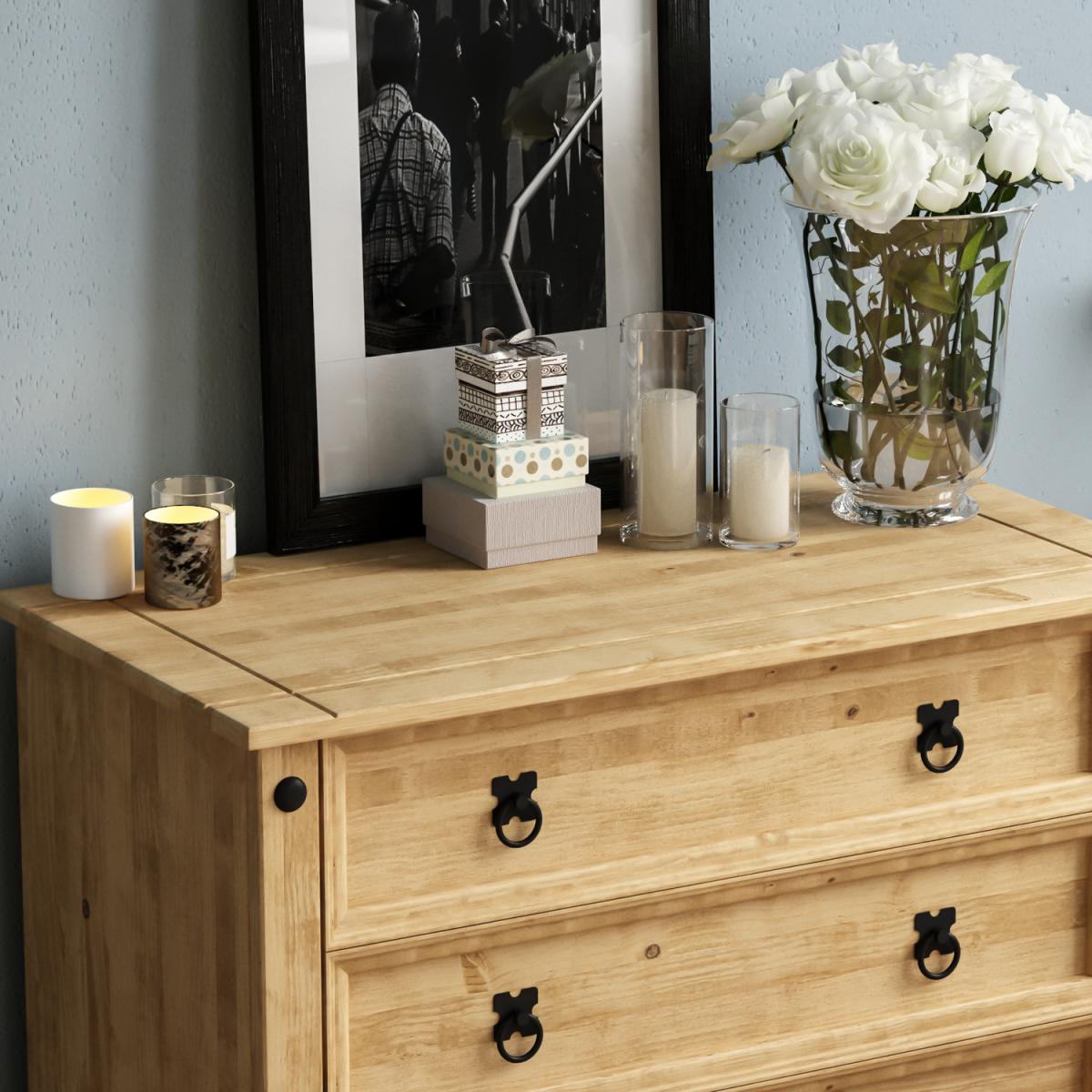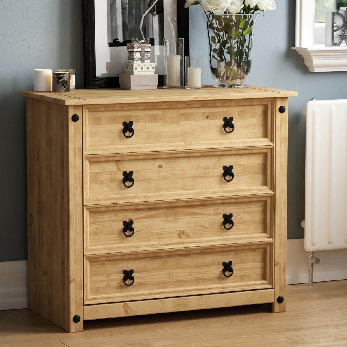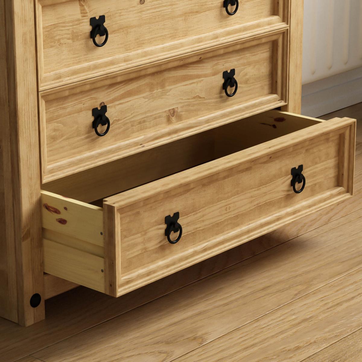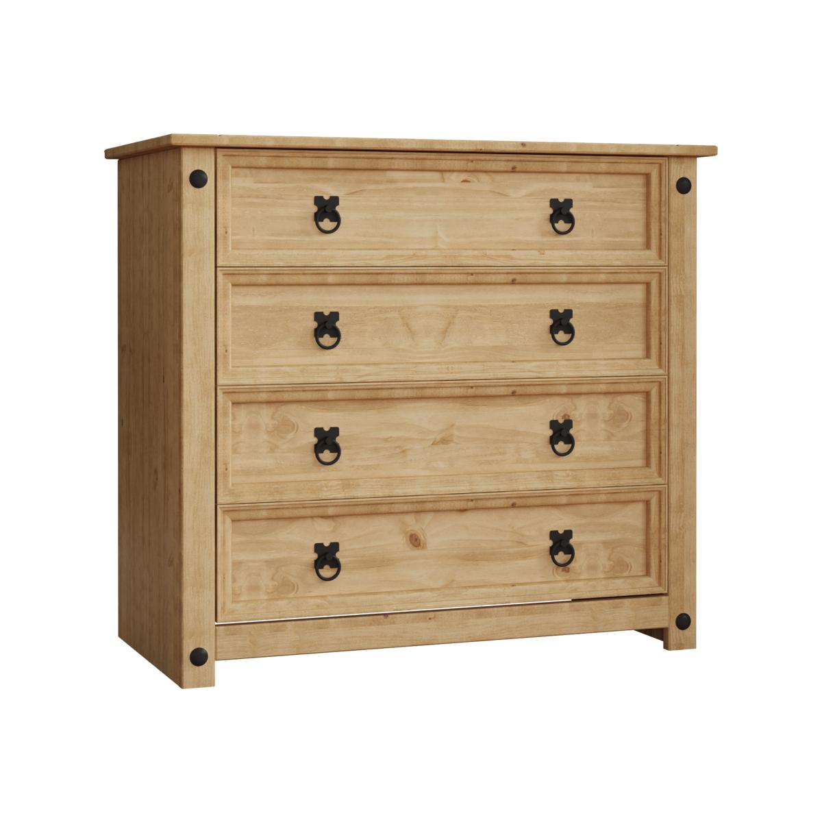 The Corona Rustic 4 Drawer Chest has a Mexican design construction featuring black metal fittings with decorative studs and a waxed finish. The wax lifts the grain of the wood creating a vintage rustic look. Four wide drawers feature decorative moulded fronts and glide on wooden runners with drawer stops to prevent them from being over extended. The cabinet frame and drawers are made of solid pine with strong plywood used for hidden surfaces such as the cabinet back and the drawer bases.