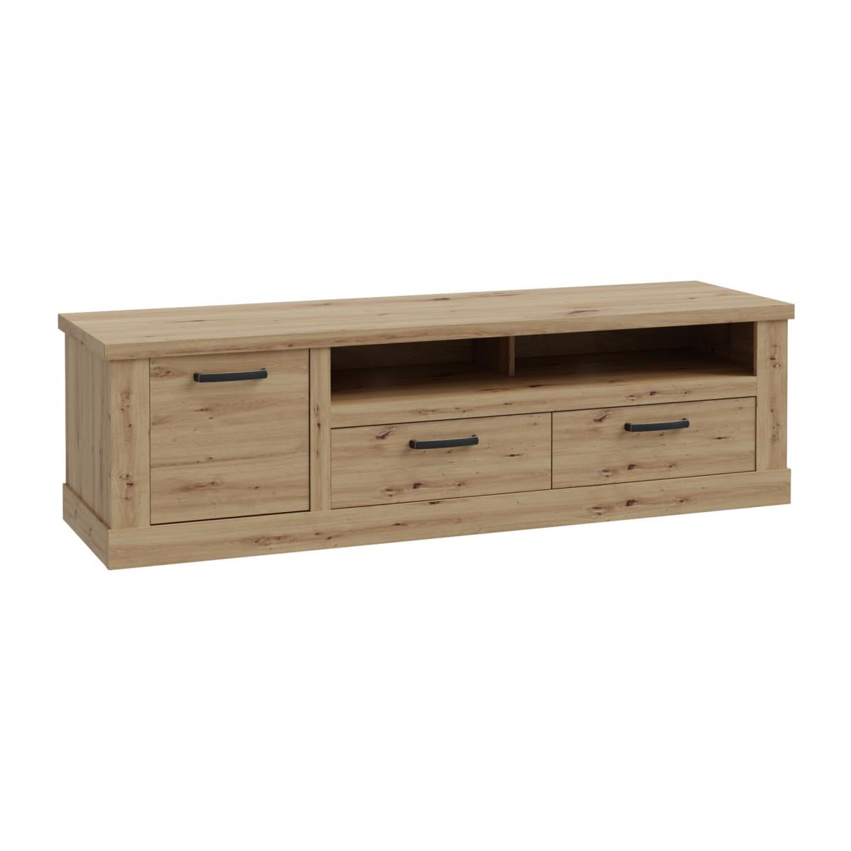Enhance your living space with the Corona Rustic TV Unit, a piece that blends practicality with timeless charm. Designed with a stylish oak finish, it offers a perfect balance of functionality and sophistication for modern homes. This unit features two spacious drawers, a single cupboard door, and an open shelf, ideal for keeping media devices, accessories, and everyday essentials neatly organised. The stylish finish brings warmth and character, making it a standout addition to your entertainment area.