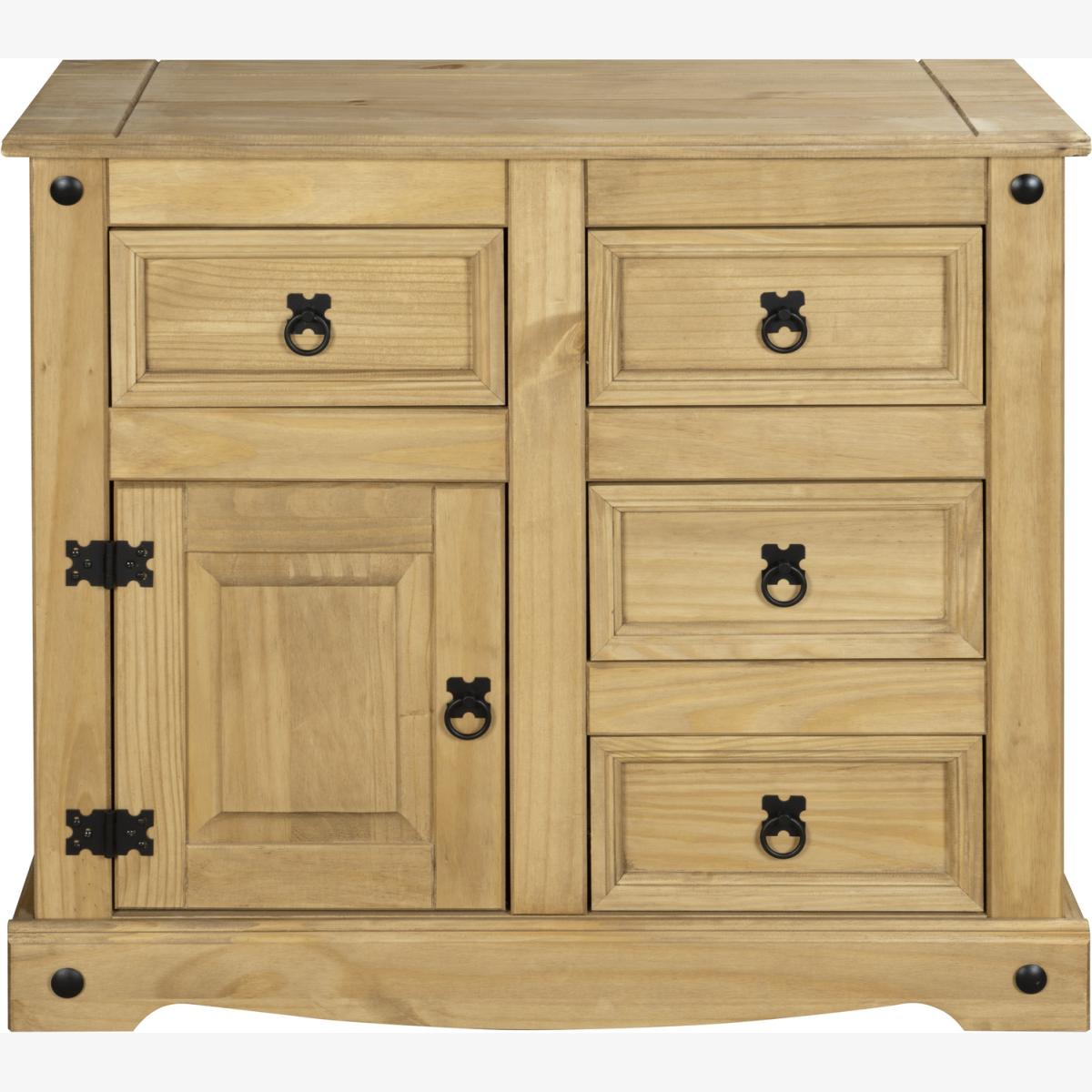 Perfect storage solution for your home, the Corona Mexican Pine 4 Drawer 1 Door Sideboard brings a warm, rustic look to any room. The waxed finish together with the black handles, hinges and studs compliment the enhanced grain of the pine. The 4 drawers are handy for storing away keys and smaller items whilst the cabinet doors allow for larger items to be organized and stored away, out of sight. Comes with wooden drawer runners and pine dowel drawer stops.