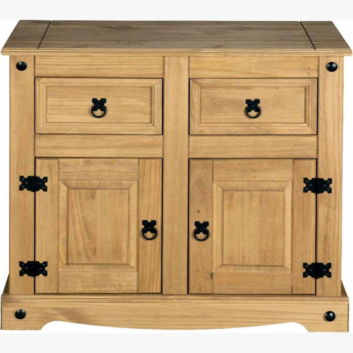 Perfect storage solution for your home, the Corona Mexican Pine 2 Draw 2 Door Sideboard brings a warm, rustic look to any room. The waxed finish together with the black handles, hinges and studs compliment the enhanced grain of the pine. The 2 drawers are handy for storing away keys and smaller items whilst the cabinet doors allow for larger items to be organized and stored away, out of sight.