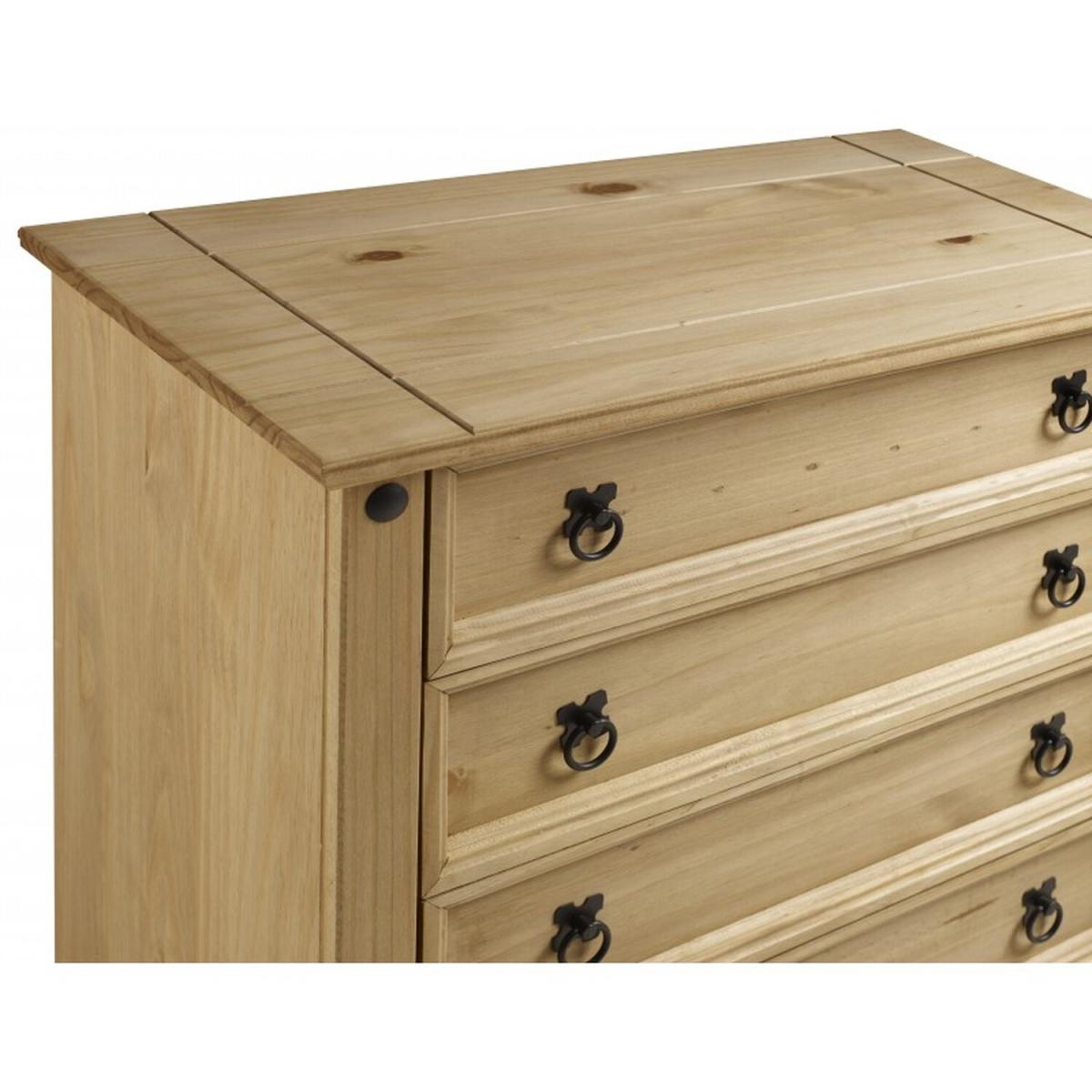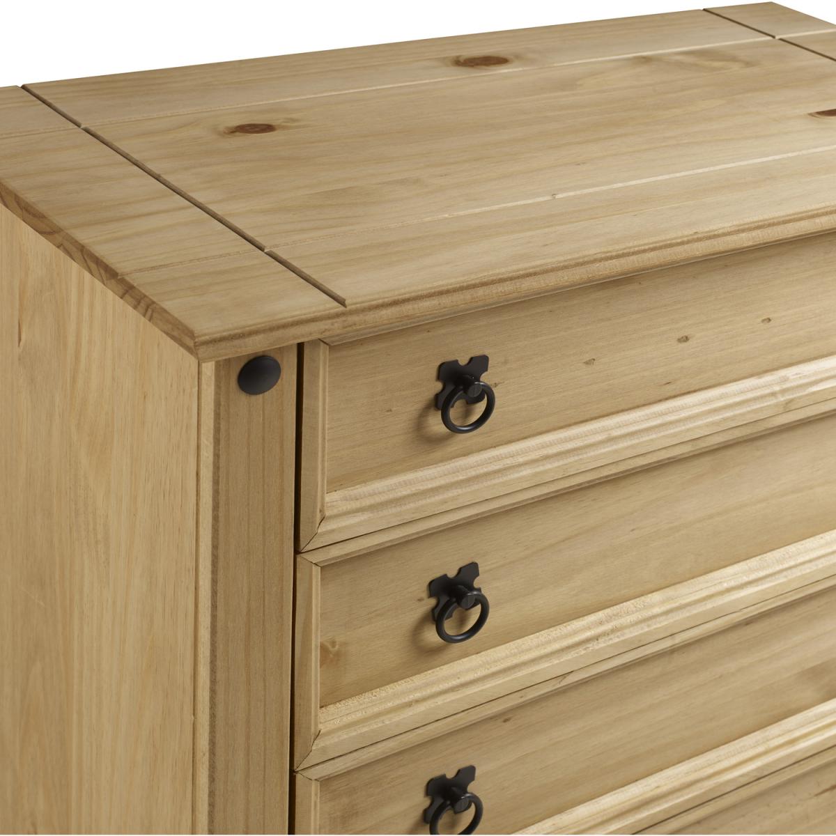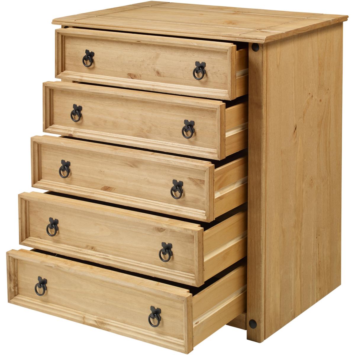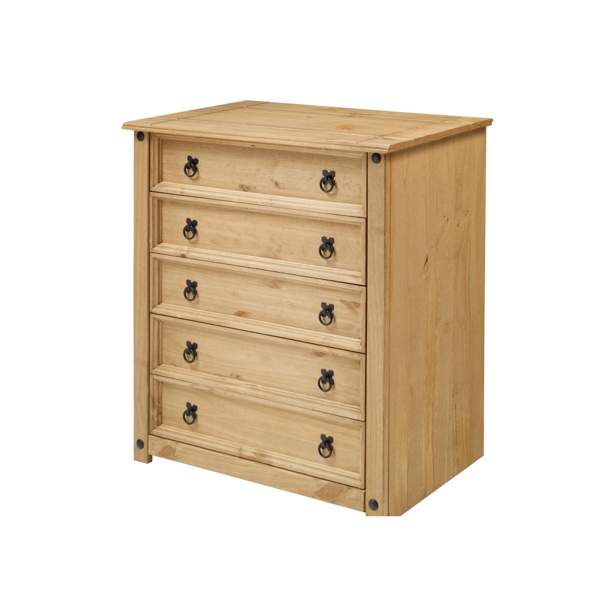 Mercers Furniture is happy to offer this Corona Small 5 Drawer Chest, the item is expertly crafted from solid pine and hand waxed to preserve as well as enhance the grain. It offers outstanding value for money with 5 drawers that would be a welcome addition to any room. It is finished off with black metal fittings which give the item its distinctive Mexican styling and offers that warm rustic country charm. The item has hardboard backs and drawer bases, its delivered flat packed for easy home assembly with step-by-step instructions. Height - 89cm. Width - 80cm. Depth - 41cm