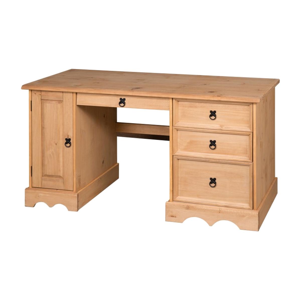 Mercers Furniture is happy to offer this Corona Straight Computer Desk, expertly crafted from solid pine and hand waxed to preserve as well as enhance the grain. With both drawers and a cupboard it offers outstanding value for money that would be a welcome addition to any home. The item is finished off with black metal fittings which give a distinctive Mexican styling and offers that warm rustic country charm. The item has hardboard backs, hardboard drawer bases and is delivered flat packed for easy home assembly with step-by-step instructions. Height - 74cm. Width - 145cm. Depth - 48cm