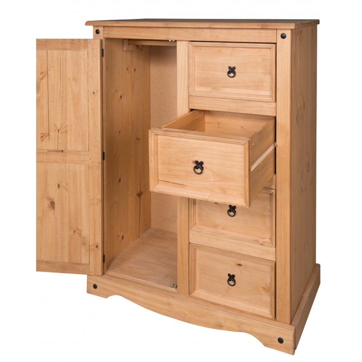 Mercers Furniture is happy to offer this Corona Tallboy Robe, the wardrobe is expertly crafted from solid pine and hand waxed to preserve as well as enhance the grain. It offers outstanding value for money with 1 door and 4 drawers that would be a welcome addition to any bedroom. It is finished off with black metal fittings which give the item its distinctive Mexican styling and offers that warm rustic country charm. The item has hardboard backs and drawer bases, its delivered flat packed for easy home assembly with step-by-step instructions.