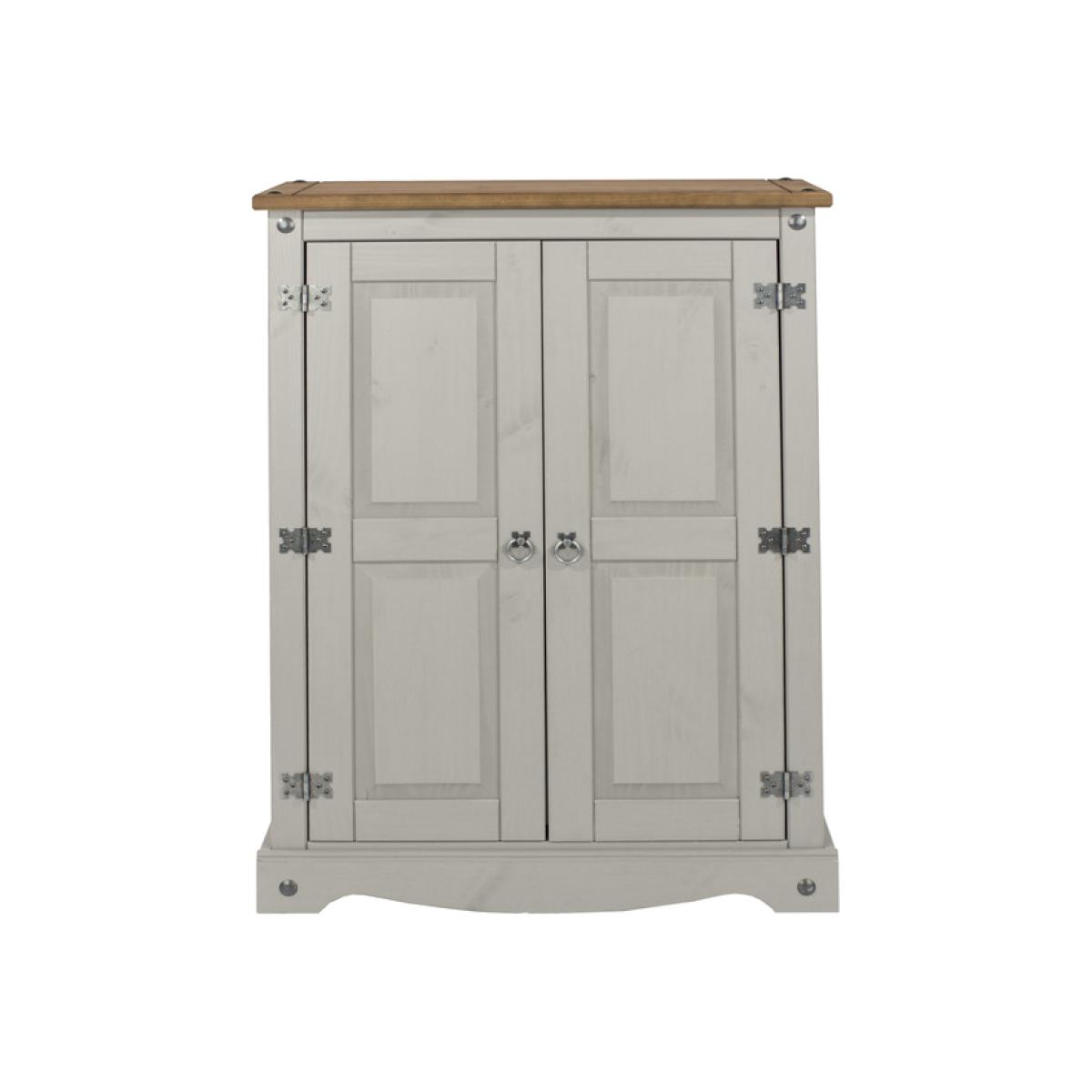 Combining antique elegance and practicality, this stunning Corona Two Door Cupboard Unit is beautifully crafted from solid pine for a robust, sturdy construction. Featuring metal pull handles and exposed hinges and stud ironmongery, this unit is a perfect addition to any room where additional storage is required. It has three spacious shelves to fold away your clothes and linens or organise your shoes and accessories, or store your books and paperwork.