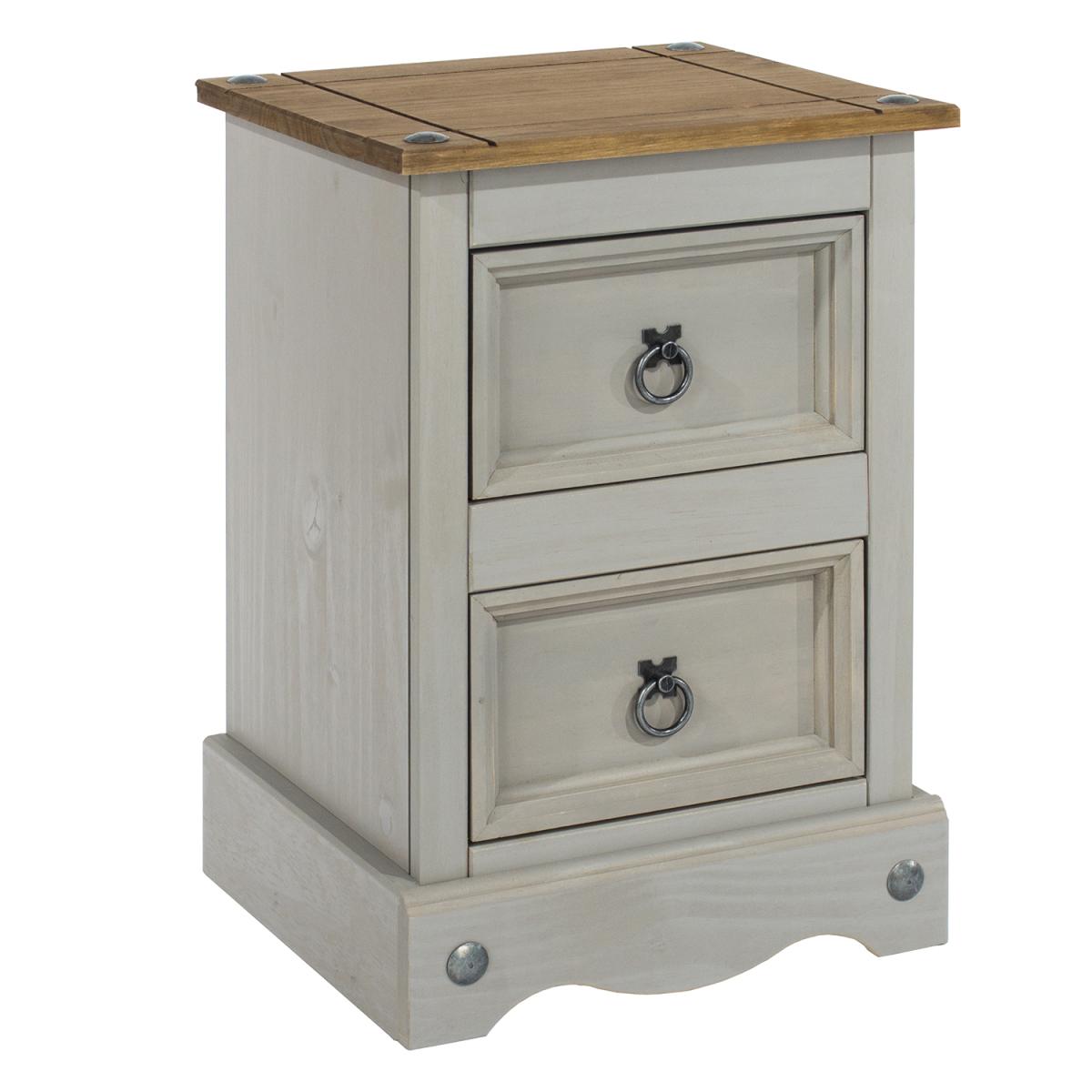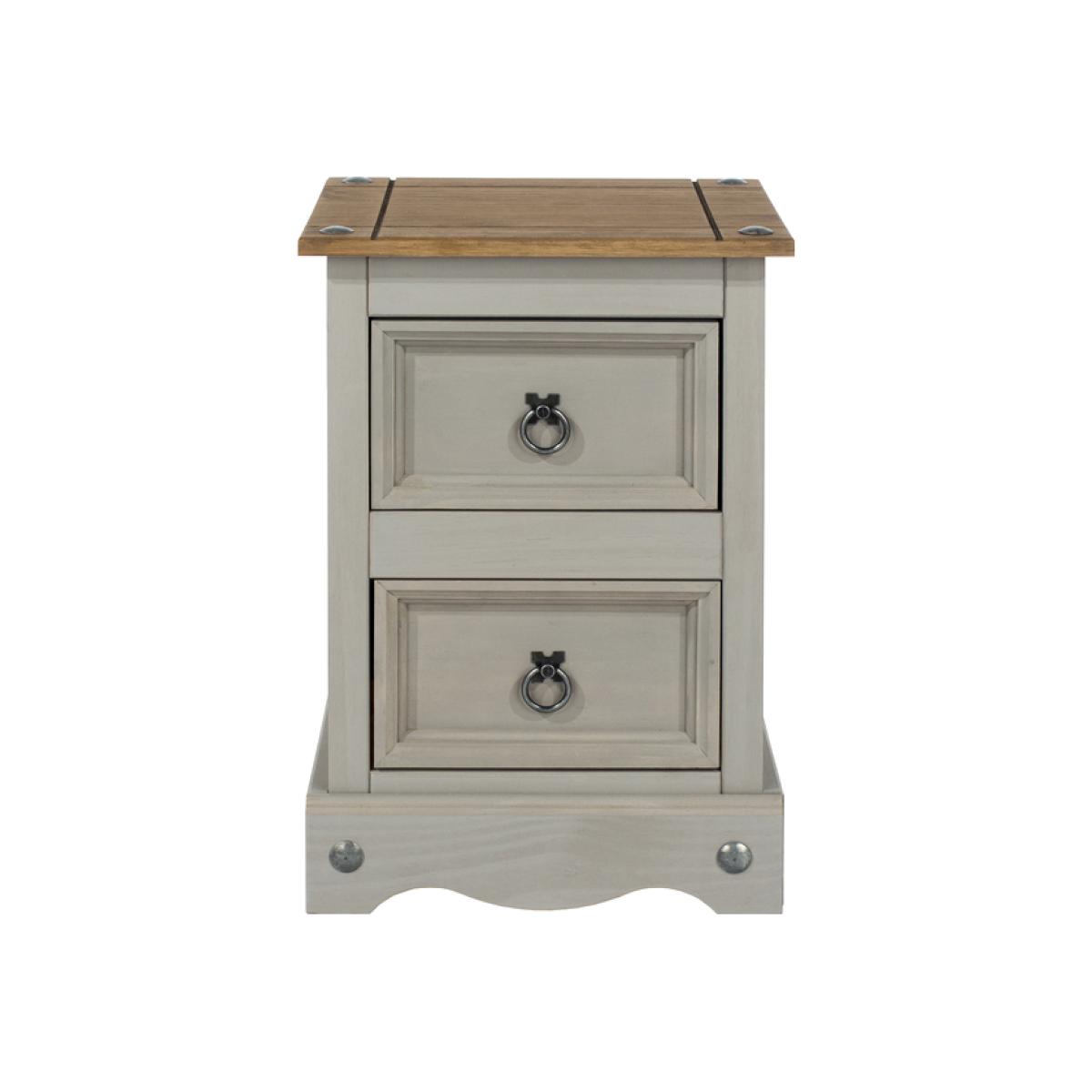 The Corona grey washed two drawer petite bedside cabinet is new to the Corona bedroom range. Features of this sturdy bedside cabinet include a petite design which has been finished to extremely high standards, two drawers, a grey washed wax effect finish with antique wax finish top surface. All handles and hardware are finished in gunmetal grey for an added modern touch.