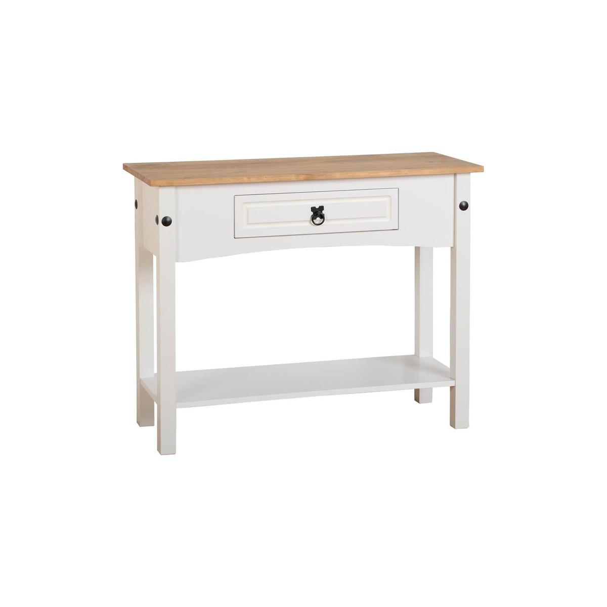 The Corona console table has a wonderful contrast finish that will brighten up any home. The white base works well with the pine top and black metal drop handles to complete the look of this piece which also has an added drawer and shelf for extra storage. Please note, unfortunately we cannot deliver this item to the Channel Islands.