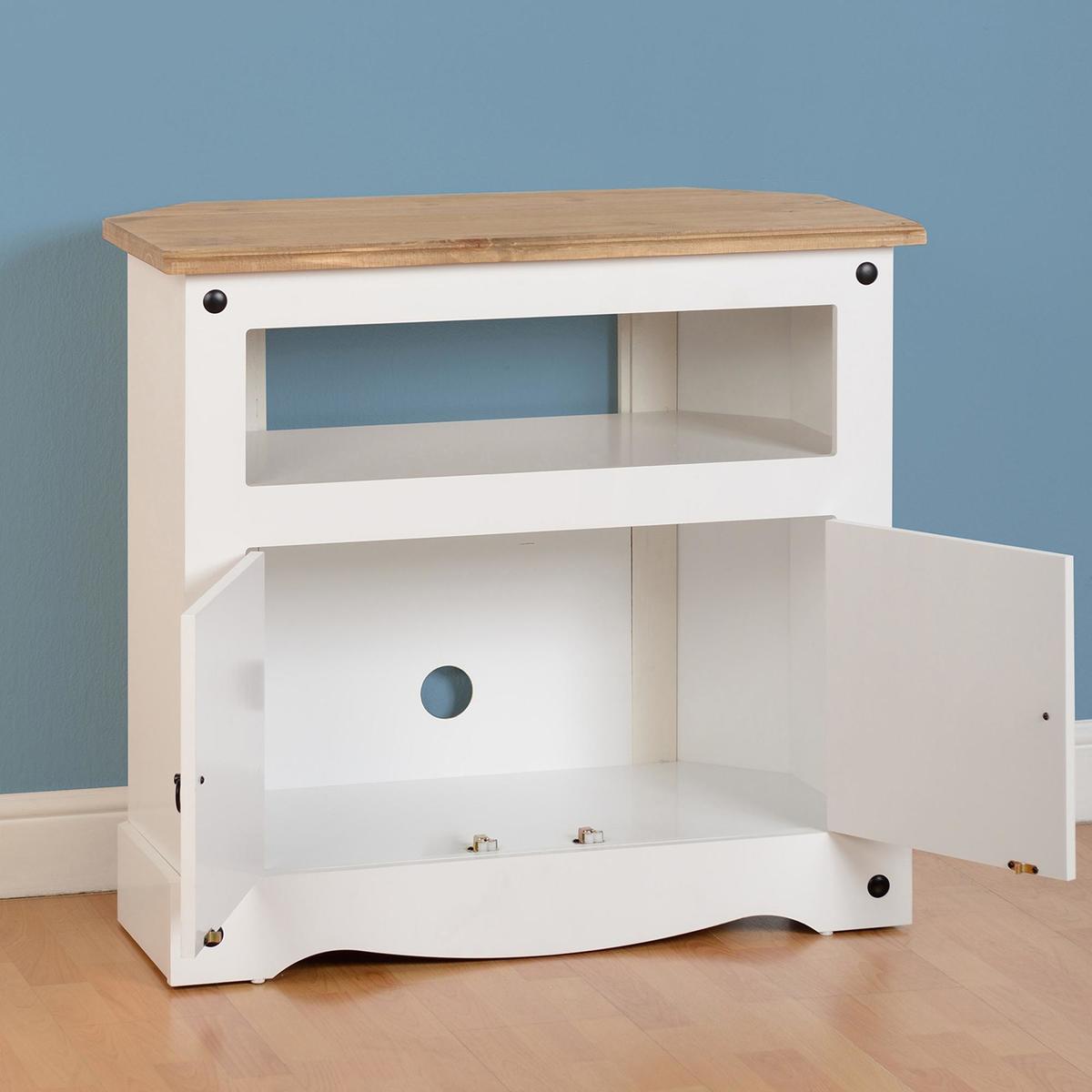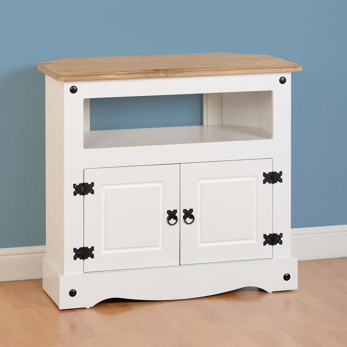 The Corona White Corner TV Unit makes for the perfect companion to any room in need of a little extra storage space. Fashioned from pine wood, the TV Unit boasts a traditional yet practical design taking up little space in the corner, but offering a shelf and cabinet space to organise electronics and TV accessories such as controls, routers and DVD players. Please note, unfortunately we cannot deliver this item to the Channel Islands.