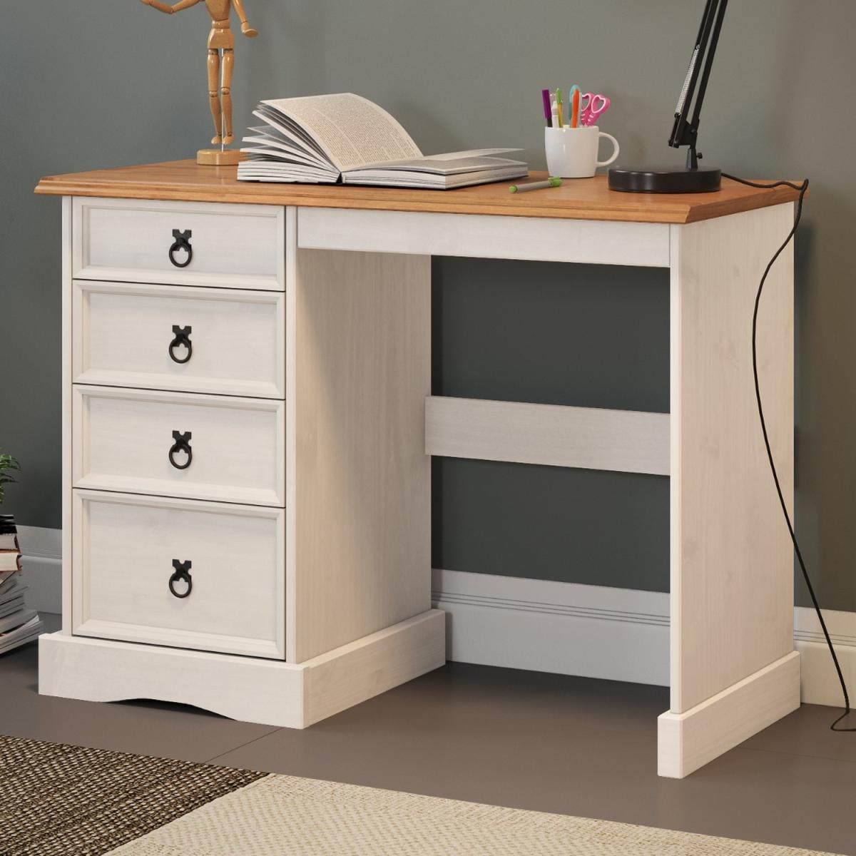 Mercers Furniture is happy to offer this Corona Dressing Table, expertly crafted from solid pine and hand waxed to preserve as well as enhance the grain. It offers outstanding value for money that would be a welcome addition to any home. Includes 4 drawers for extra storage the item is finished off with black metal fittings which give a distinctive Mexican styling and offers that warm rustic country charm. The item has hardboard backs and drawer bases, its delivered flat packed for easy home assembly with step-by-step instructions. Height - 77cm. Width - 105cm Depth - 49cm Elevate your morning routine with the Mercers Furniture Corona White Wax Dressing Table, a stunning centerpiece for any bedroom or dressing area. Crafted with exquisite attention to detail, this dressing table combines classic elegance with contemporary charm to create a functional and stylish space for your beauty rituals. Constructed from solid pine wood, this dressing table boasts exceptional durability and longevity, ensuring years of reliable use. The white wax finish accentuates the natural grain of the wood, adding a touch of rustic allure to its timeless design. Enhance the functionality and style of your bedroom or dressing area with the Mercers Furniture Corona White Wax Dressing Table. Whether used as a standalone piece or paired with matching furniture from the Corona collection, this dressing table effortlessly blends practicality with elegance to create a space you'll love to adorn and admire. Solid pine with hardboard backboards and drawer bases. Supplied flat pack for easy home assembly. Height 78cm Width 105cm Depth 49cm