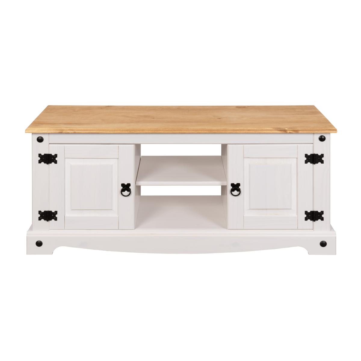 Bring a touch of rustic charm to your living space with the Corona White 2 Door 1 Shelf TV Stand. This stand features a double cupboard and 2 shelves, providing ample storage for your media appliances and keeping your space organized. Ample Storage: The double cupboard and 2 shelves offer plenty of space for storing media appliances, books, or decor items. Rustic Design:The whitewash finish combined with rustic details adds a charming touch to any room decor. Durable Construction: Made from sturdy materials, this TV stand is built to last for years to come.