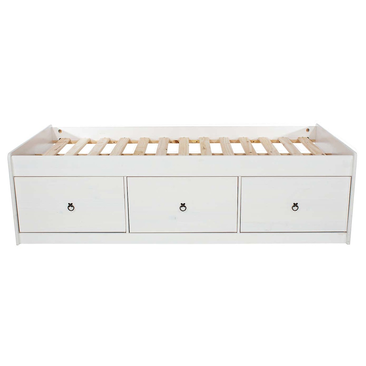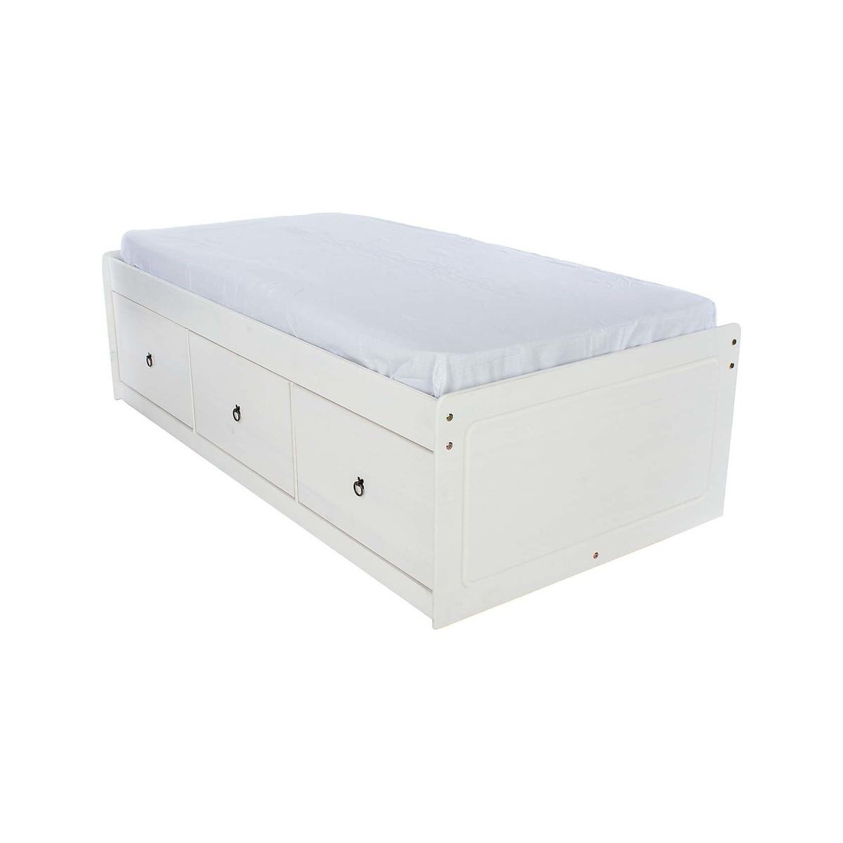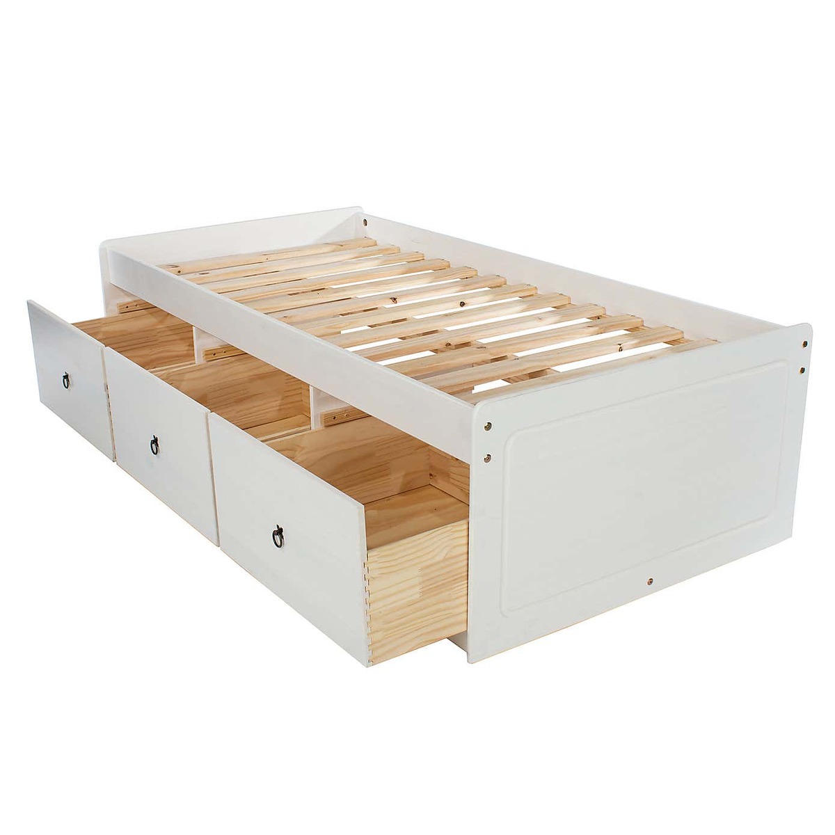 A well crafted, solid pine single cabin bed with a whitewash pine finish and three drawers with metal drop handles.