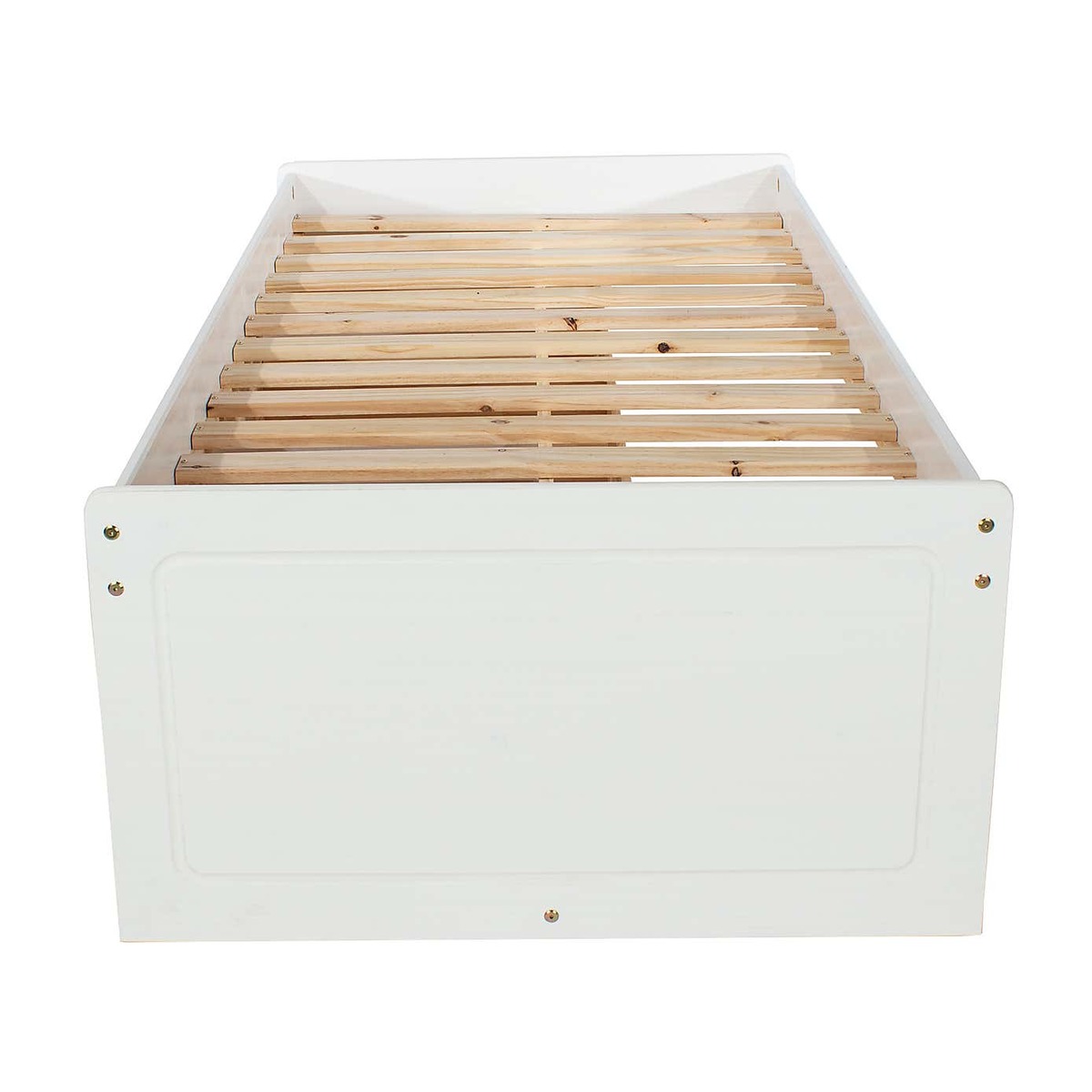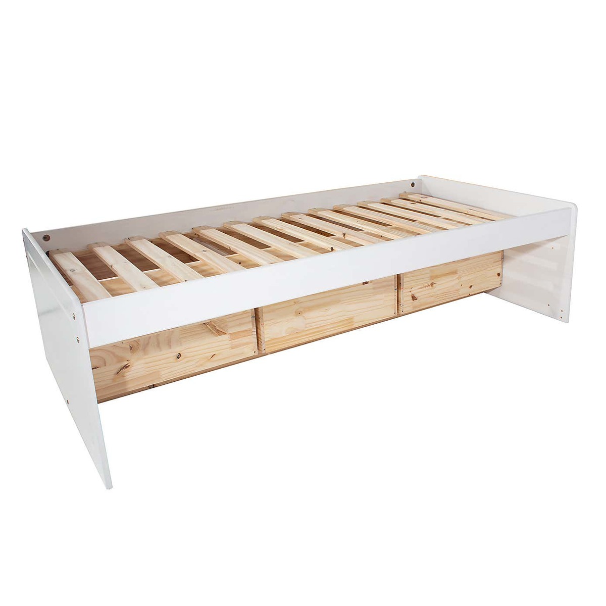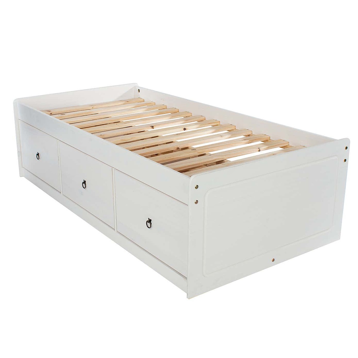 A well crafted, solid pine single cabin bed with a whitewash pine finish and three drawers with metal drop handles.